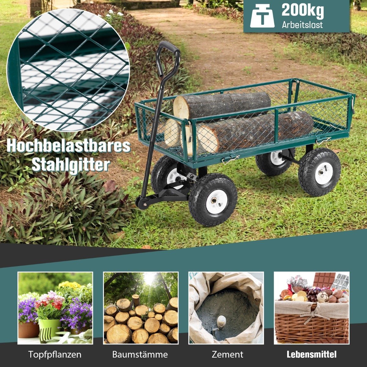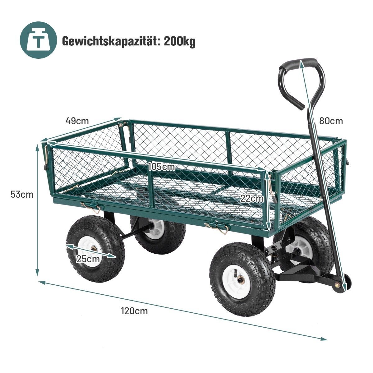 Metalinis vežimėlis su 25 cm guminėmis padangomis ir nuimamu bortu (Žalia)