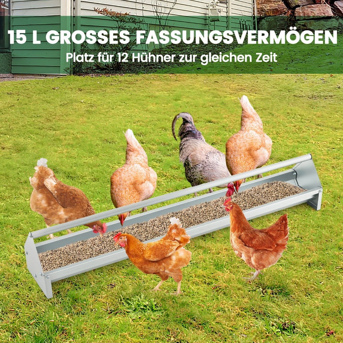 - Didelė 15 litrų talpa, skirta vienu metu pamaitinti 12 vištų.