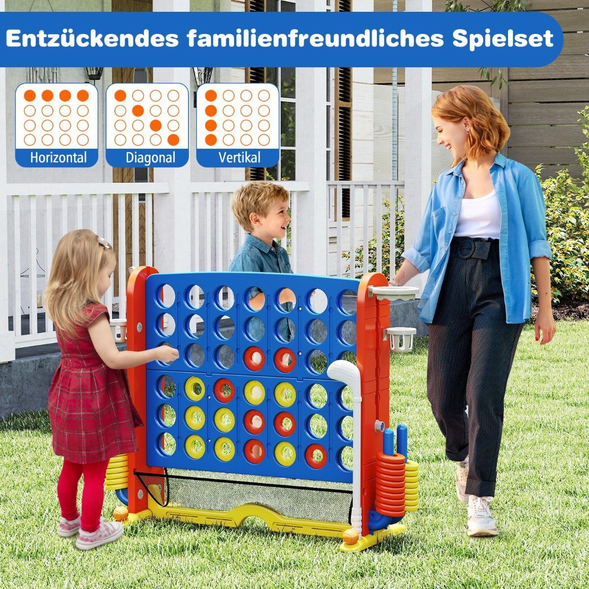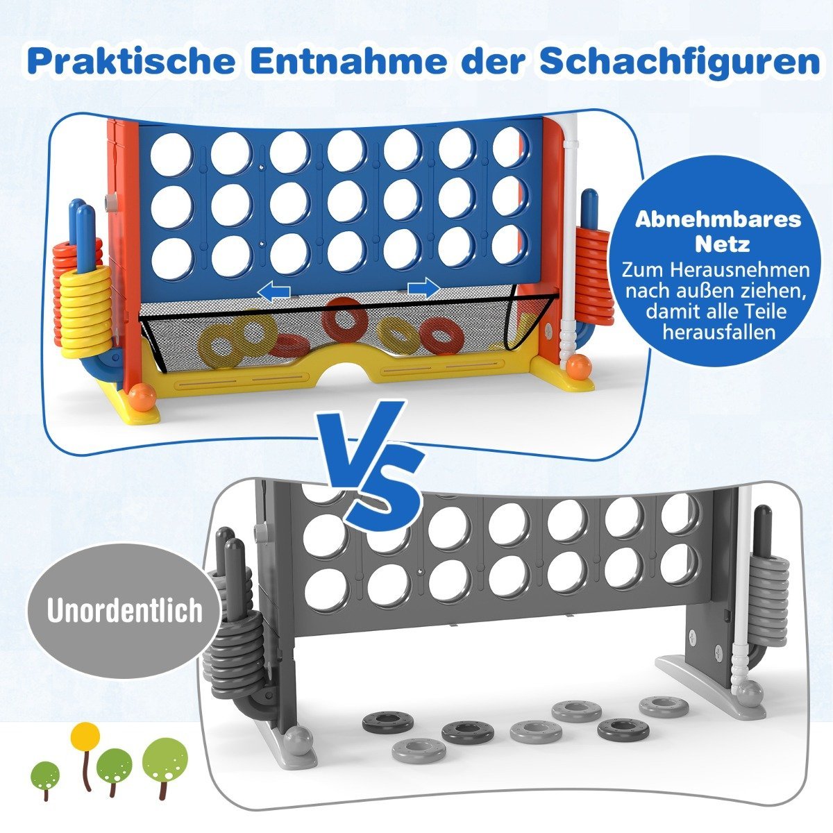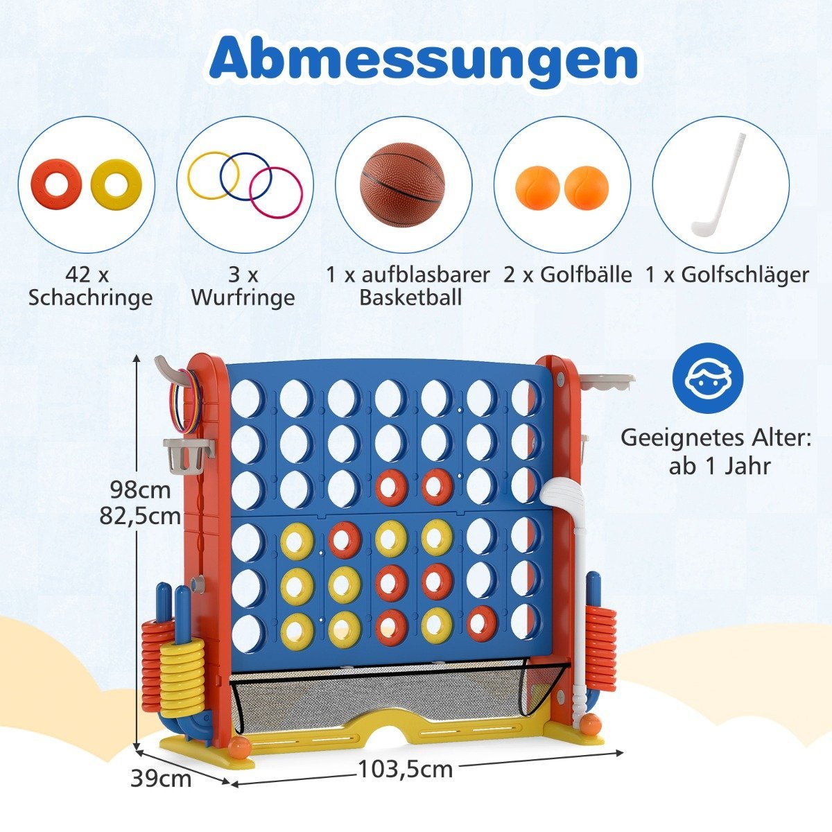 • Integruotas 4-in-1 žaidimų kompleksas: „Keturios eilėje“, krepšinis, žiedų mėtymas ir mini golfas.
