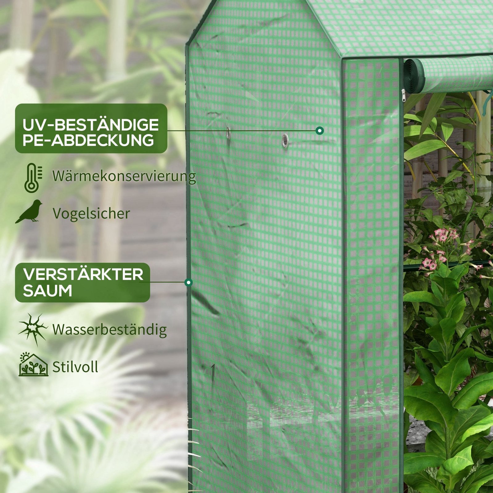 Su dviejų patalpų šiltnamiu sodininkystei nebelieka jokių ribų. Su tvirtu plieniniu rėmu ir UV spinduliams atspariu plastikiniu dangčiu jūsų augalai turės apsaugotą vietą optimaliam augimui. Dėl dangčio augalai taip pat galės sugerti saulės šviesą. Be to, susukamos durys užtikrina lengvą prieigą prie nešiojamojo šiltnamio, o angos – šviežio oro tiekimą.
