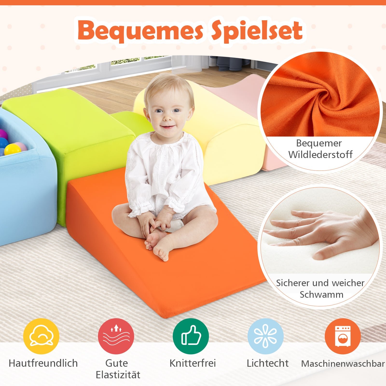 - Daugiafunkcinis 5 dalių rinkinys: laipiojimo, šliaužiojimo ir kamuoliukų baseino elementai lavina kūrybiškumą bei motorinius įgūdžius.