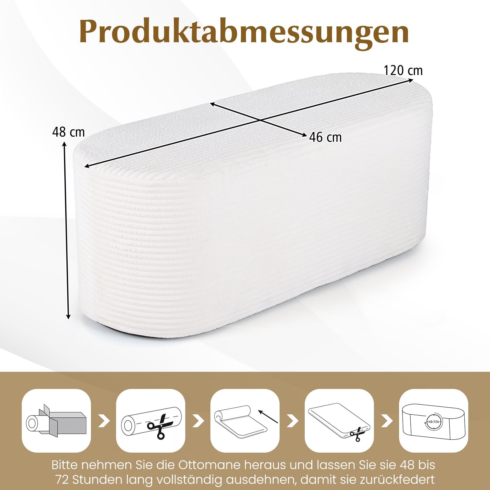 - Nereikia jokio surinkimo – tiesiog išpakuokite ir leiskite pufui atgauti pilną formą.