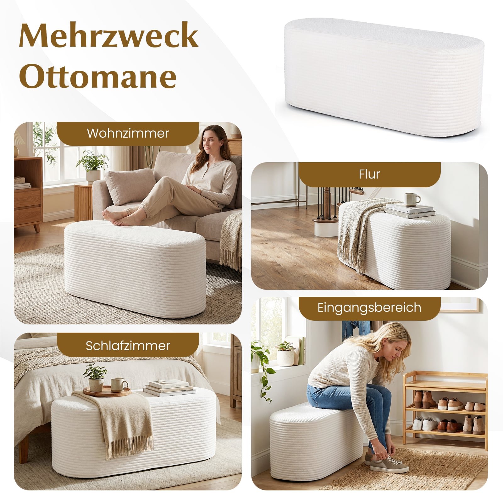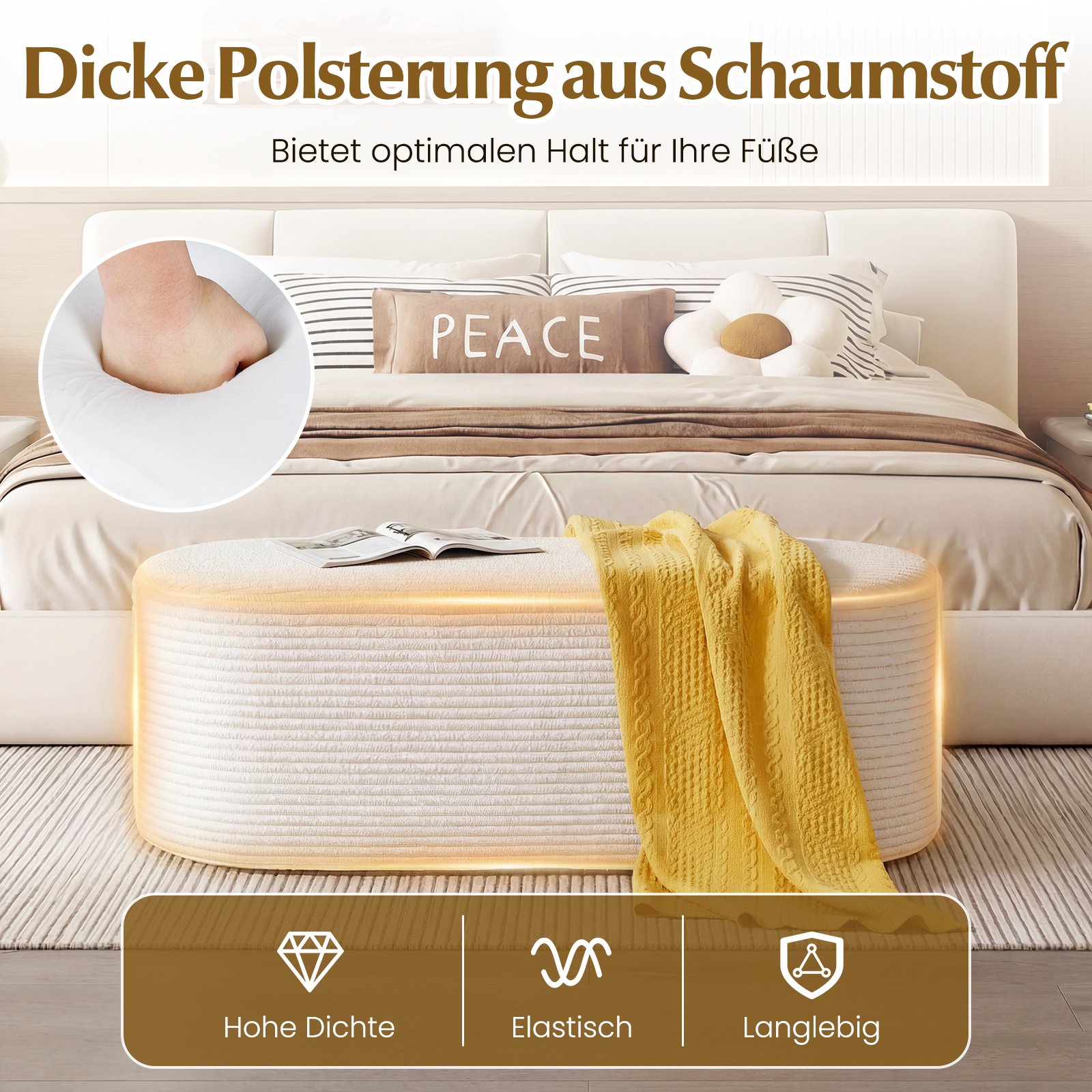 - Universalus naudojimas: puikiai tinka kaip kojų pufas, suoliukas batams ar papildoma sėdimoji vieta svetainėje, miegamajame ar prieškambaryje.