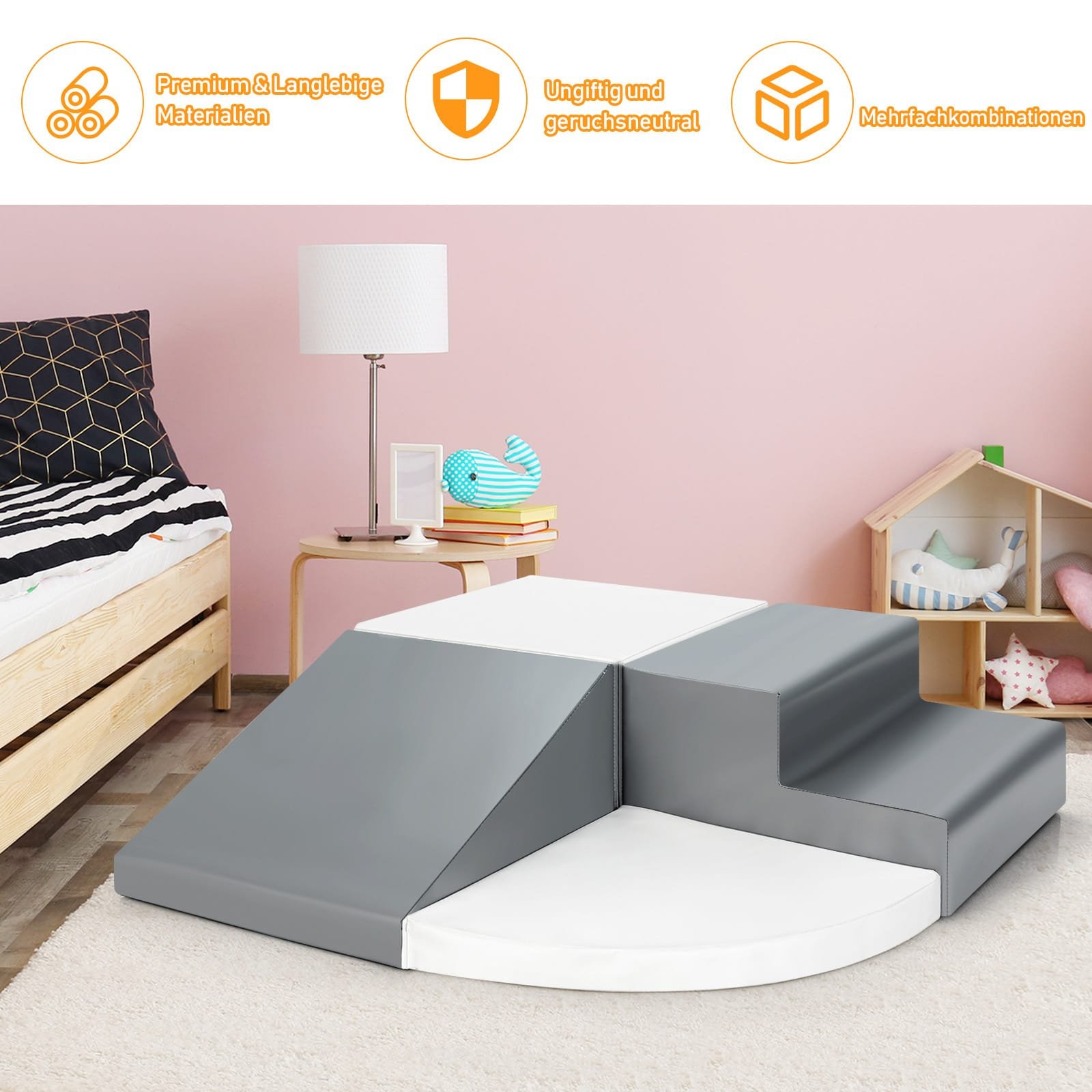 Šis aukštos kokybės EPE putplasčio aktyvumo žaidimų rinkinys yra saugus ir minkštas jūsų kūdikiui. Jums nereikės nerimauti dėl galimų sužeidimų, nes minkšti laipiojimo elementai apsaugo vaiko kelius ir alkūnes. Dėl lengvo dizaino vaikams bus paprasta perstatyti ir konstruoti įvairius elementus. Be to, nešvarumams atsparus paviršius palengvina valymą ir priežiūrą, taupydamas jūsų laiką bei energiją.