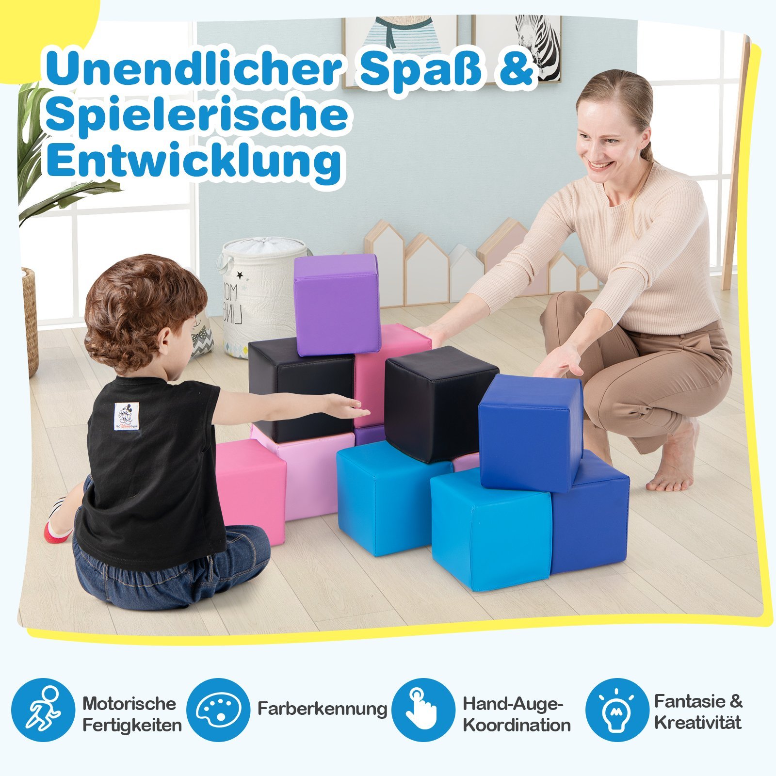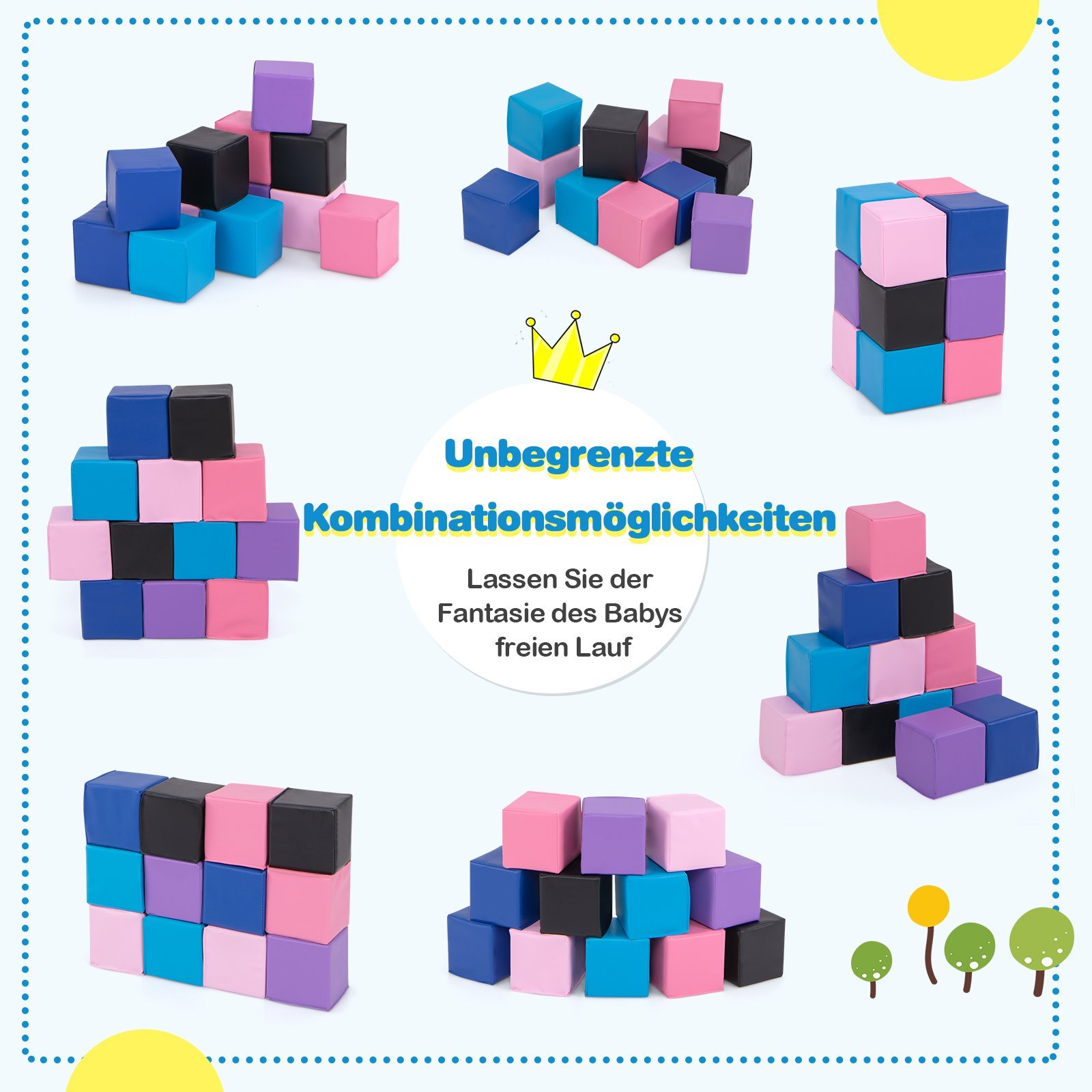 Padovanokite vaikams begalinį džiaugsmą ir lavinamąją patirtį su mūsų 12 dalių putplasčio kaladėlių rinkiniu! Šis rinkinys sukurtas skatinti kūrybiškumą saugioje ir spalvingoje aplinkoje. Kiekviena minkšta EPE putplasčio kaladėlė yra puikiai pritaikyta mažoms rankytėms, skatinanti griebimo, statymo ir net laipiojimo įgūdžius, tuo pačiu lavindama bendrąją motoriką bei rankų-akių koordinaciją. Lengva konstrukcija leidžia jūsų vaikui be vargo perkelti kaladėles.