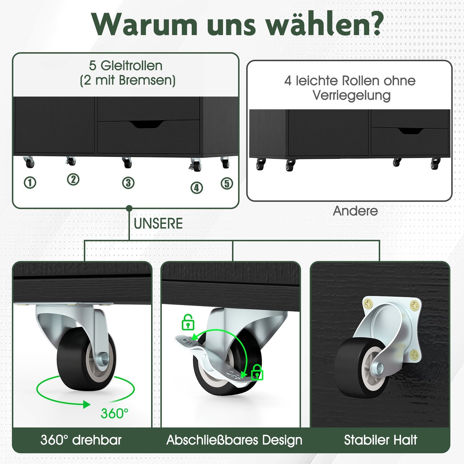 - Penki 360° besisukantys ratukai (du su stabdžiais) užtikrina lengvą judėjimą ir patikimą fiksavimą.