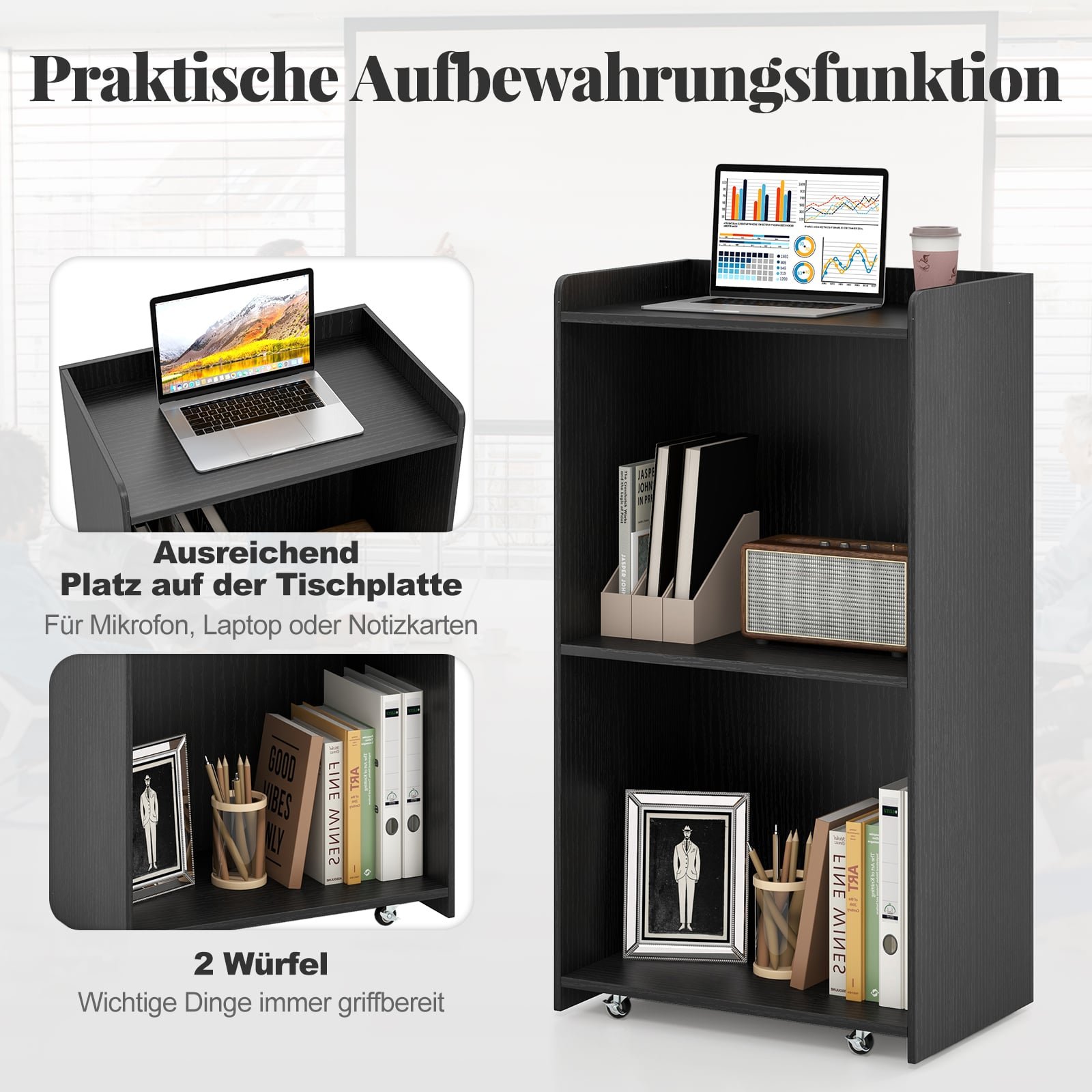 Patobulinkite savo prezentacijas ir viešas kalbas su šiuo 105 cm aukščio stovimu pultu. Idealus bažnyčioms, mokykloms ir prekybos vietoms, šis daugiafunkcis pultas suteikia pakankamai vietos knygoms ir dokumentams, padedant palaikyti tvarkingą ir organizuotą darbo aplinką. Sklandžiai riedantys ratukai leidžia lengvai keisti jo poziciją, o du fiksuojami ratukai užtikrina stabilumą. Saugų naudojimą garantuoja apsauga nuo daiktų nukritimo ir suapvalinti kampai, o lengvai valomas paviršius reikalauja minimalios priežiūros.
