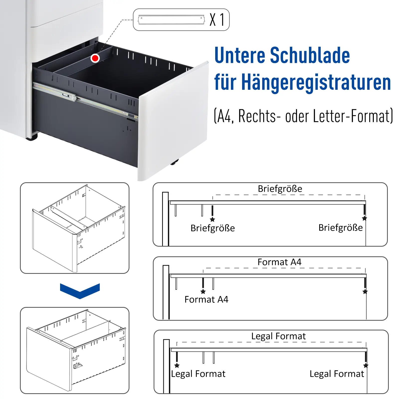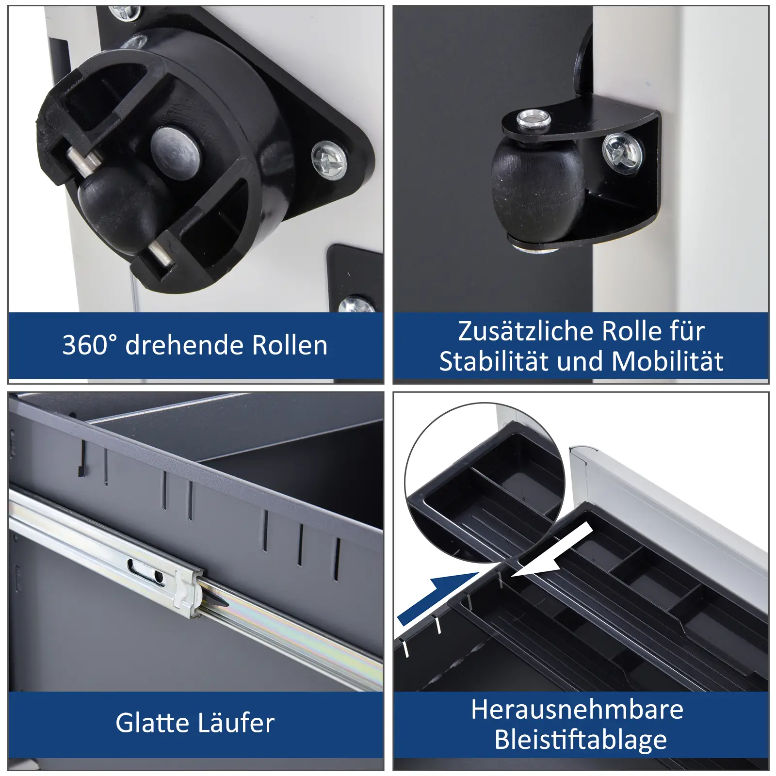 Laikykite savo dokumentus saugiai ir tvarkingai su mūsų biuro spintelėmis su ratukais. Su dviem praktiškais stalčiais biuro reikmenims ir pakabinamų segtuvų rėmu, spintelė su ratukais suteikia daug vietos daiktams. Paprastas, kompaktiškas dizainas puikiai tinka mažesnėms erdvėms, tiek namuose, tiek biure. Dėl 4 pasukamų ratukų dokumentų spintelę galima lengvai perkelti, o plieninis korpusas garantuoja ilgaamžiškumą. Viršutiniame skyriuje esantis užraktas užrakina visus tris skyrius.