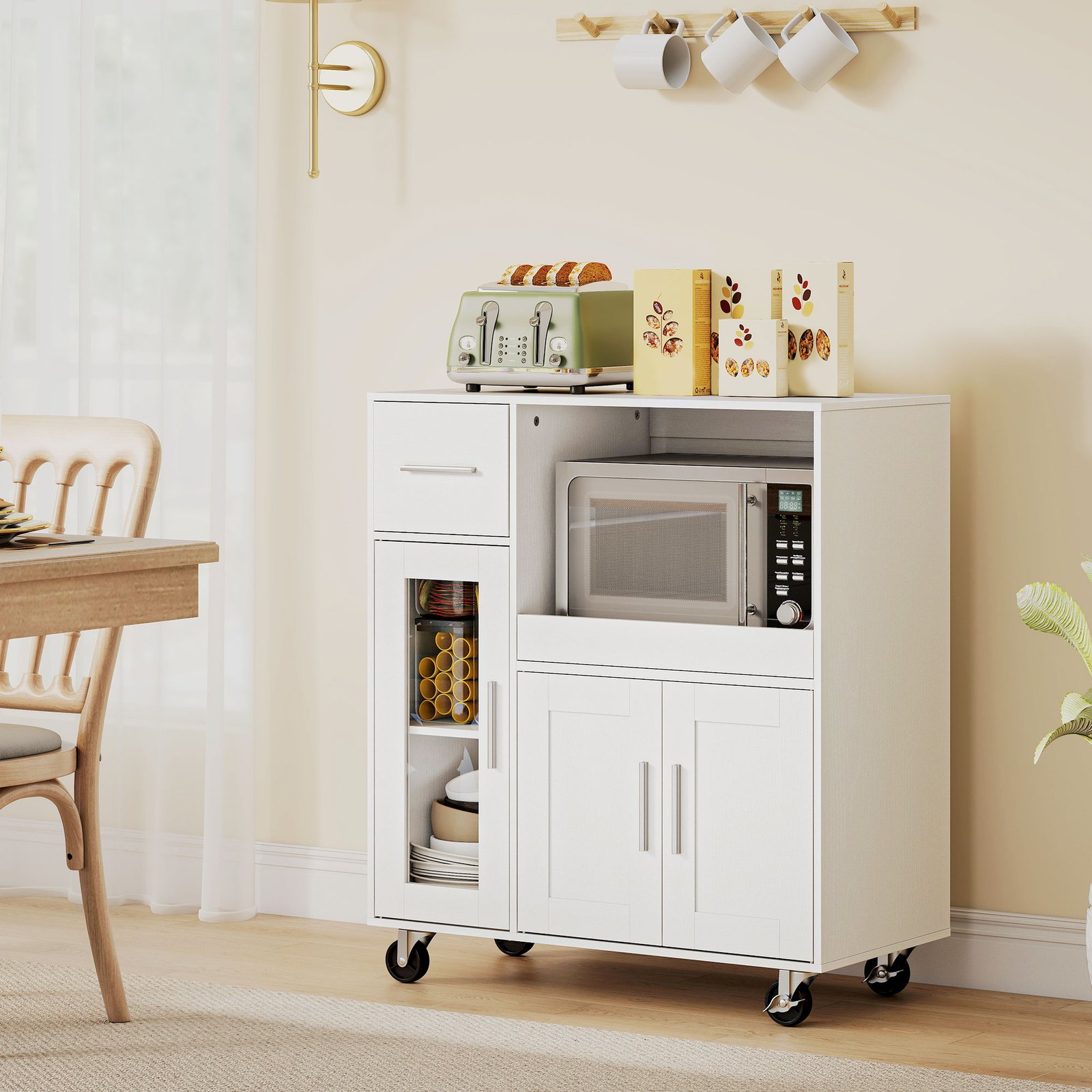 Perkrauta, ankšta virtuvė paverčia maisto gaminimą našta. Nuolatinė vietos paieška ir susivėlusių laidų atpainiojimas sukelia nereikalingą stresą. Ši virtuvinė spintelė vėl įneša ramybę į jūsų namus: ištraukiamas mikrobangų krosnelės skyrius tvarkingai laiko jūsų mikrobangų krosnelę, o stalčiai ir spintelės praktiškai rūšiuoja jūsų virtuvės reikmenis, sukurdami džiaugsmingą ir efektyvią maisto gaminimo atmosferą.