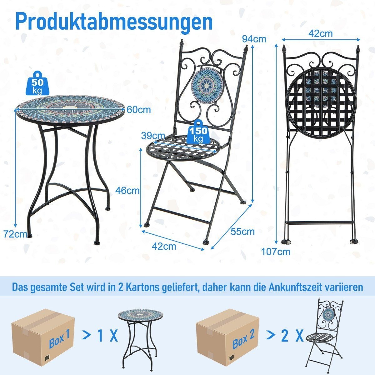 Papuoškite savo lauko erdvę ar namų interjerą šiuo stilingu 3 dalių mozaikos bistro komplektu. Jo tvirtas metalinis rėmas ir patogios kėdės su atlošais užtikrina ilgaamžiškumą ir komfortą, o unikalus mozaikos dizainas suteikia elegancijos.