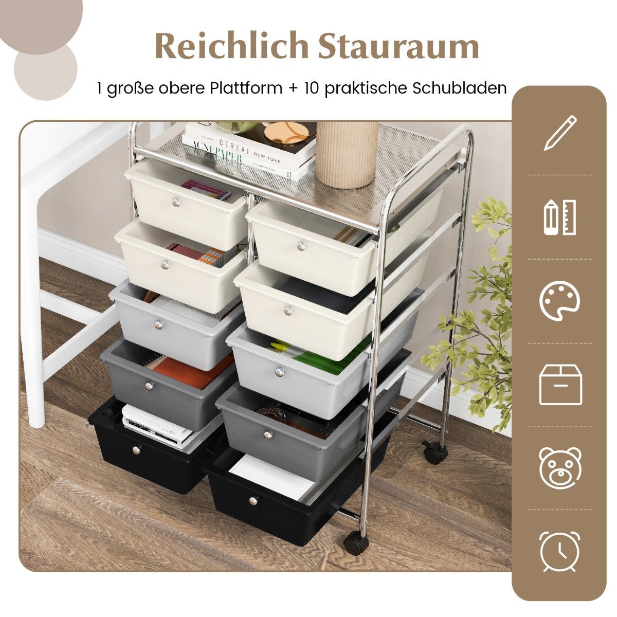 Ieškote praktiško ir stilingo sprendimo tvarkymui namuose, biure ar klasėje? Šis mobilus 10 stalčių laikymo vežimėlis yra universali priemonė, padėsianti sutvarkyti įvairius daiktus – nuo dokumentų ir biuro reikmenų iki darbo įrankių ar rankdarbių. Dėl jo jūsų erdvė atrodys tvarkingesnė ir funkcionalesnė.