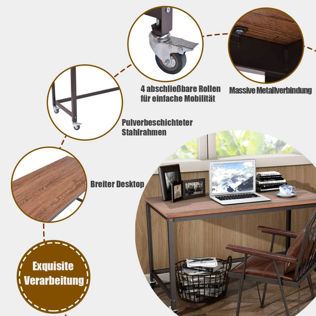 Šis daugiafunkcis stalas – idealus sprendimas bet kuriam biurui ar darbo kambariui, lengvai pritaikomas jūsų individualiems poreikiams. Jis gali būti naudojamas kaip darbo vieta, valgomojo stalas ar kompiuterio stalas. Dėl praktiško dizaino su ratukais ir fiksavimo mechanizmu, tai itin lankstus pasirinkimas.