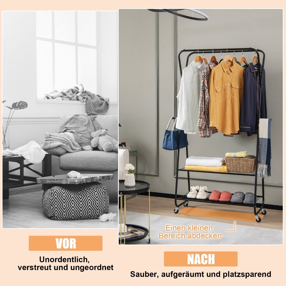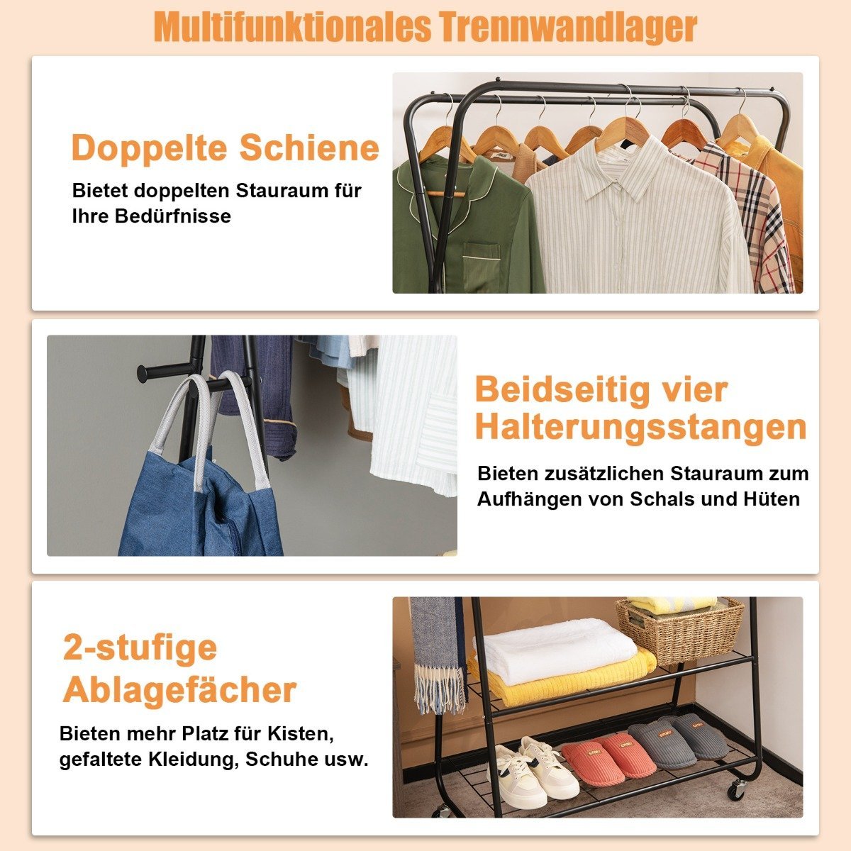 Mūsų mobilus drabužių kabyklos stovas ant ratukų – tai puikus sprendimas tiems, kuriems reikia papildomos vietos drabužiams laikyti. Šis daugiafunkcinis 3-in-1 stovas turi dvi pakabinimo sijas, dvi metalines lentynas ir keturis šoninius kabliukus. Tai suteikia pakankamai vietos drabužiams, kepurėms, rankinėms, batams ir kitiems smulkiems daiktams laikyti, padedant sutvarkyti jūsų erdvę. Tvirtas metalas su milteline danga užtikrina stabilumą ir ilgaamžiškumą, o ratukai leidžia lengvai perkelti stovą.
