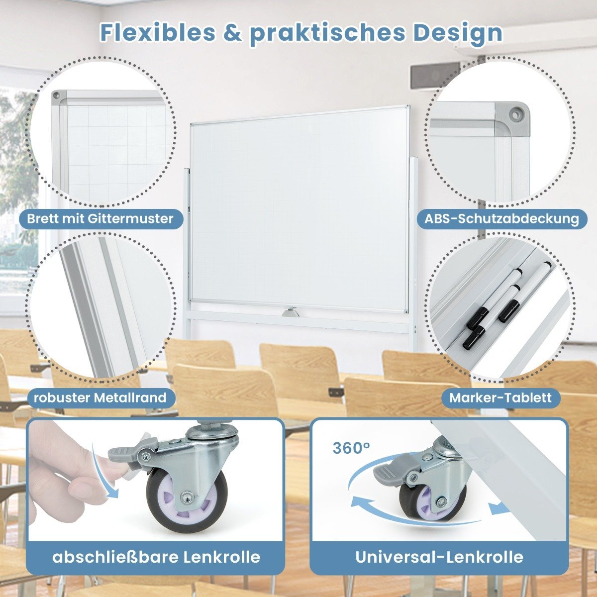 Ši dvipusė rašomoji lenta yra universali ir praktiška priemonė, puikiai tinkanti mokymui, prezentacijoms ar kūrybinėms dirbtuvėms. Jos reguliuojamas aukštis užtikrina patogumą įvairaus amžiaus naudotojams.