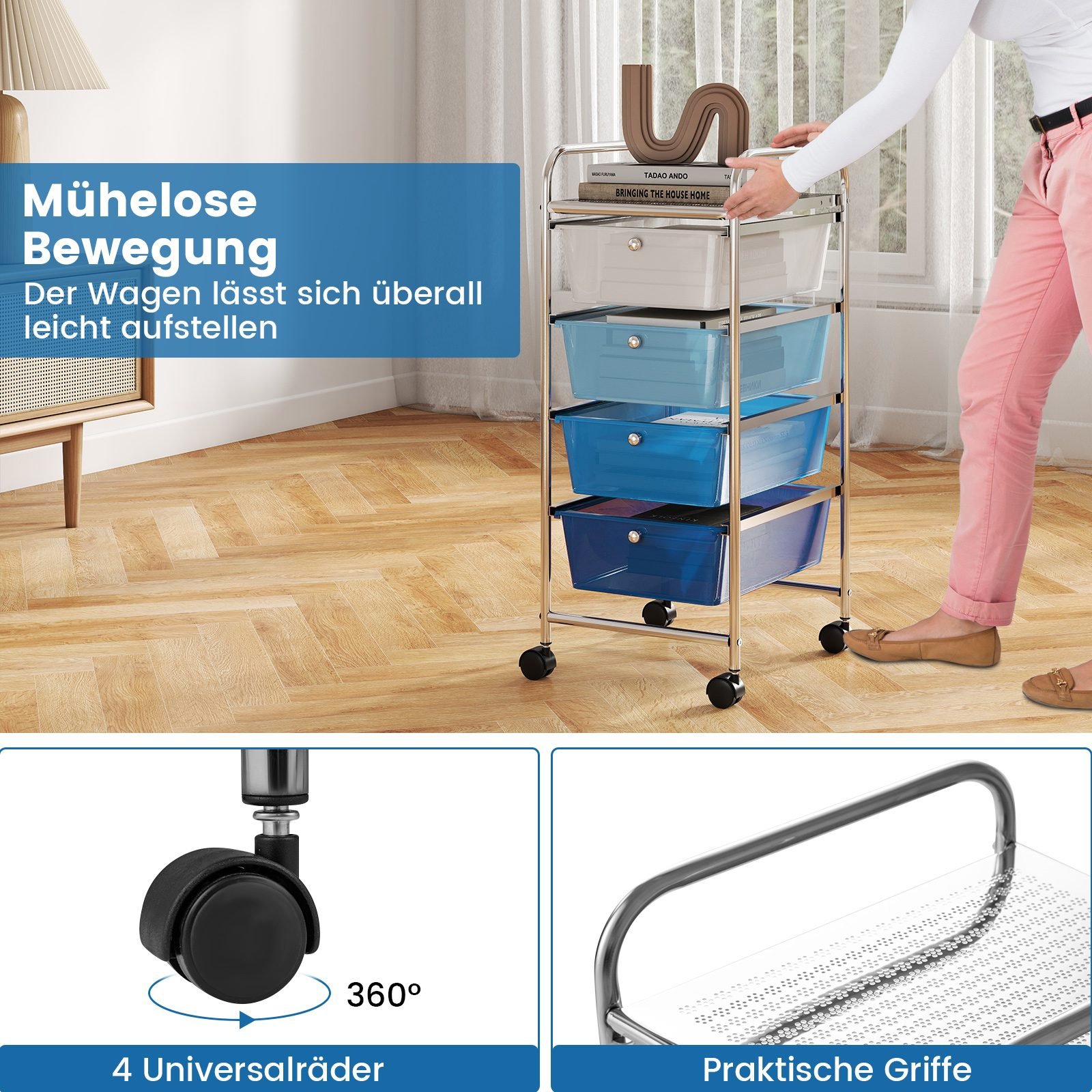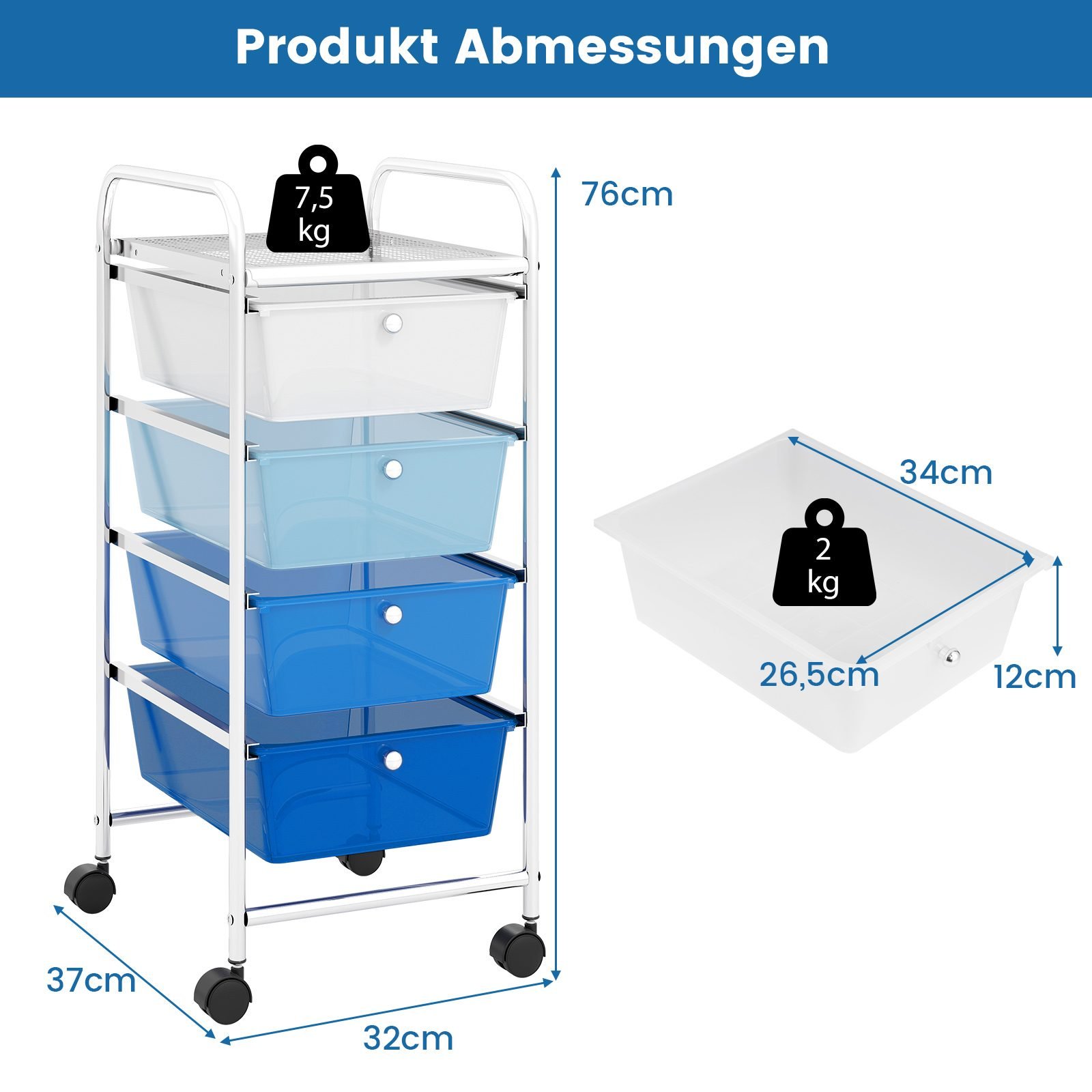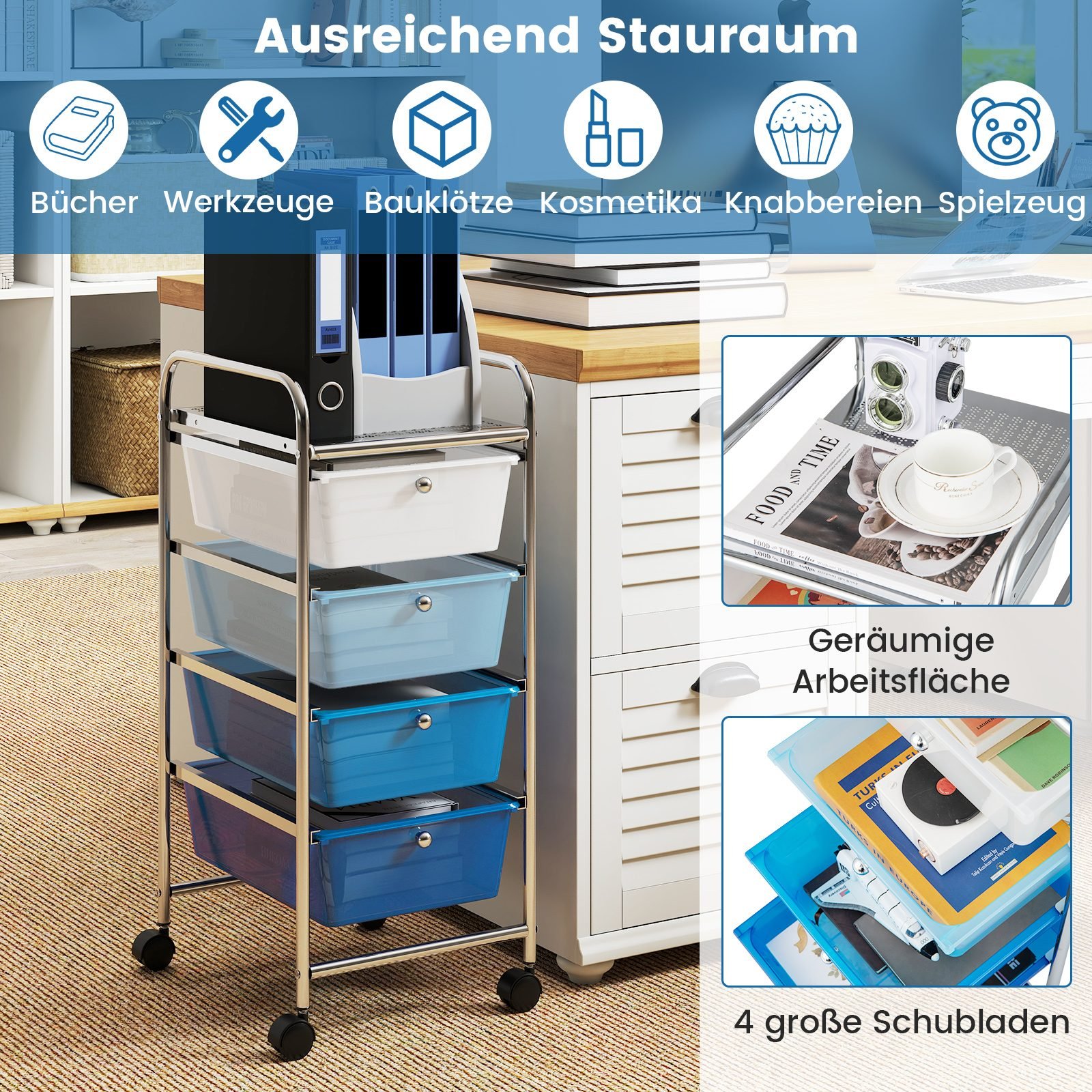 Mobilus keturių stalčių laikymo vežimėlis su ratukais (Mėlyna)