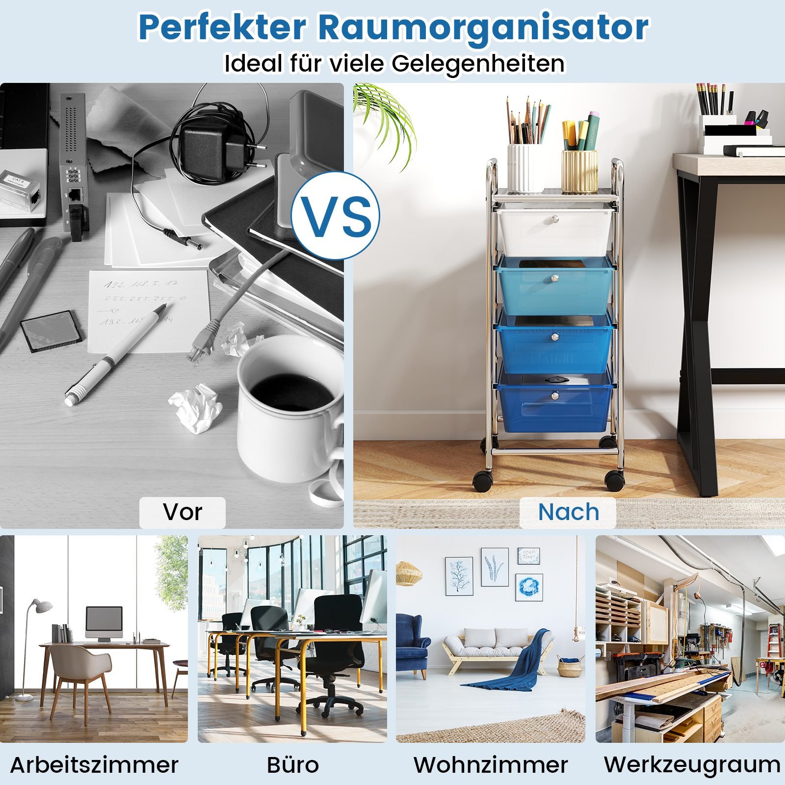 Sutvarkykite savo erdvę su šiuo universaliu 4 stalčių laikymo vežimėliu! Jo vertikalus dizainas taupo vietą ir leidžia patogiai atskirai laikyti įvairius daiktus. Nuimami stalčiai palengvina valymą ir daiktų tvarkymą, o ratukai užtikrina lengvą judėjimą.