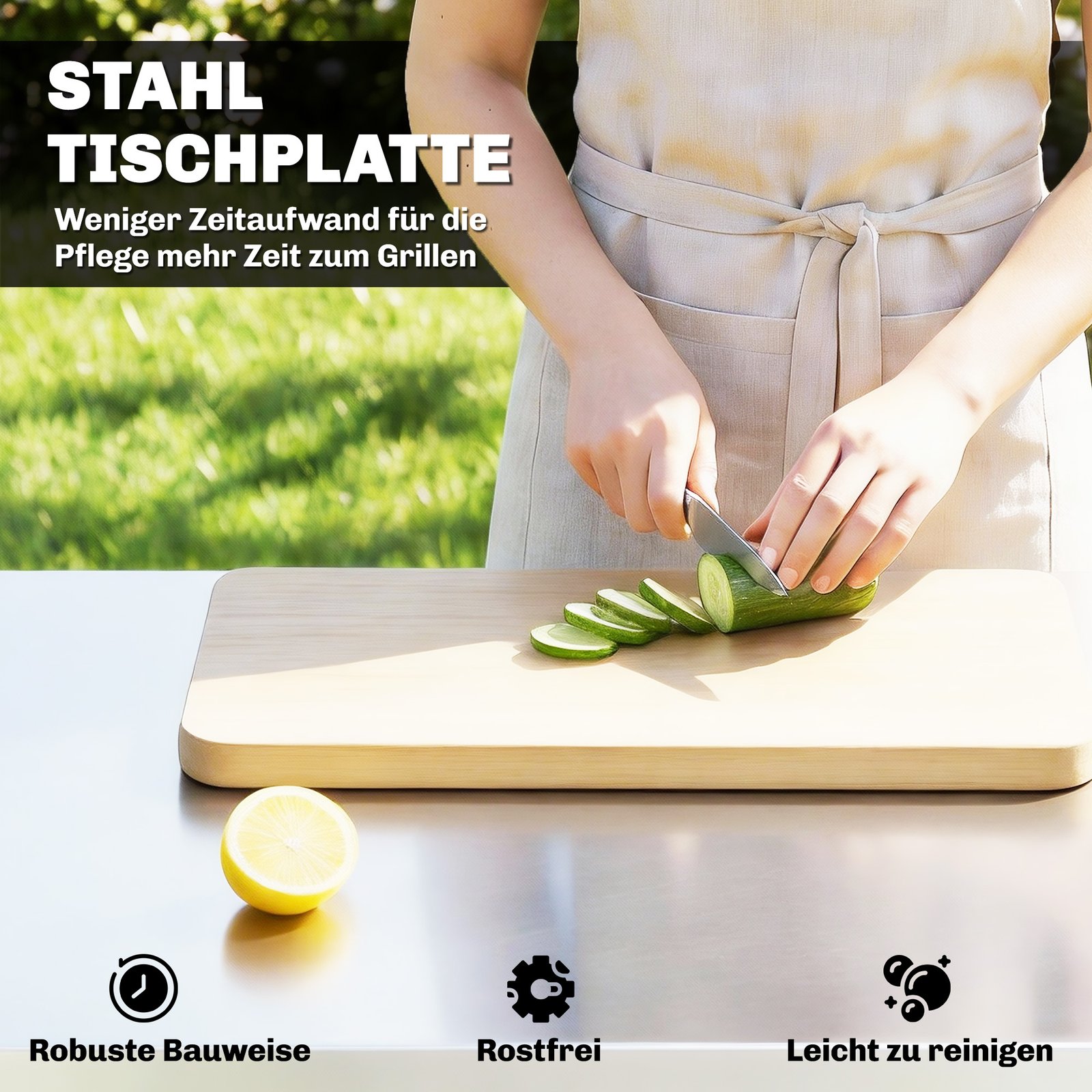 ✔ Nerūdijančio plieno paviršius ant šio grilio stalo suteikia specialią vietą maisto ruošimui.