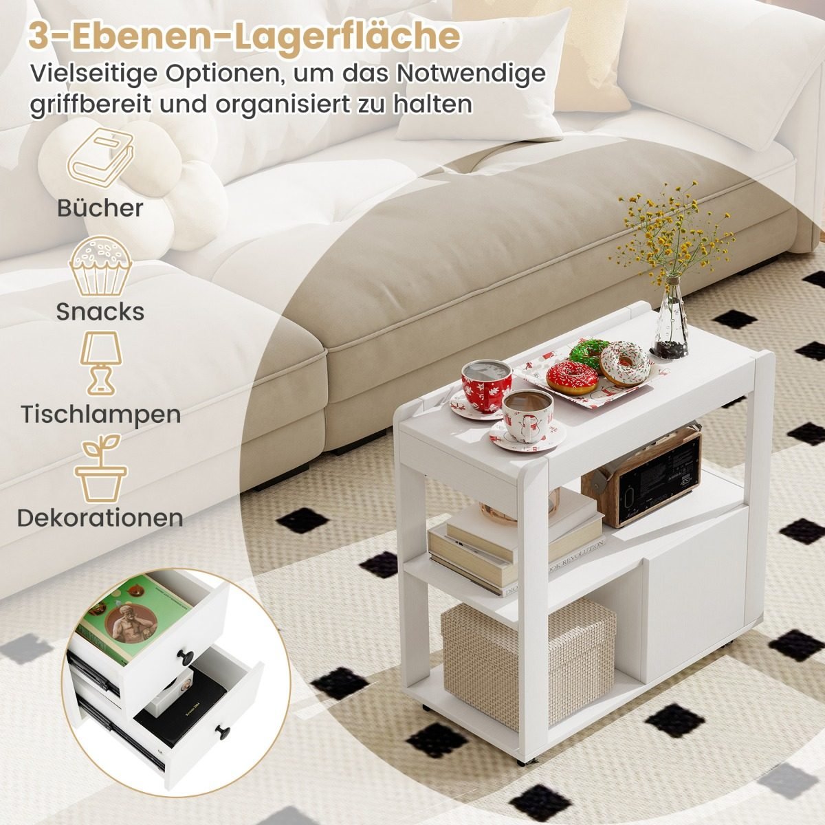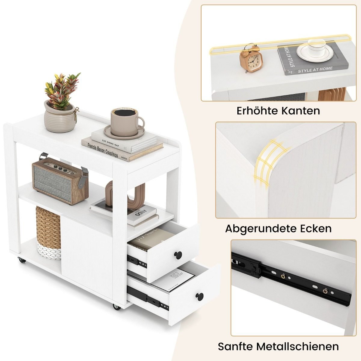 Tobulai papildykite savo namų erdvę su šiuo funkcionaliu ir stilingu mobiliu staleliu ant ratukų. Sukurtas maksimaliam Jūsų patogumui, jis lengvai tilps siaurose erdvėse ir suteiks papildomos vietos Jūsų daiktams.