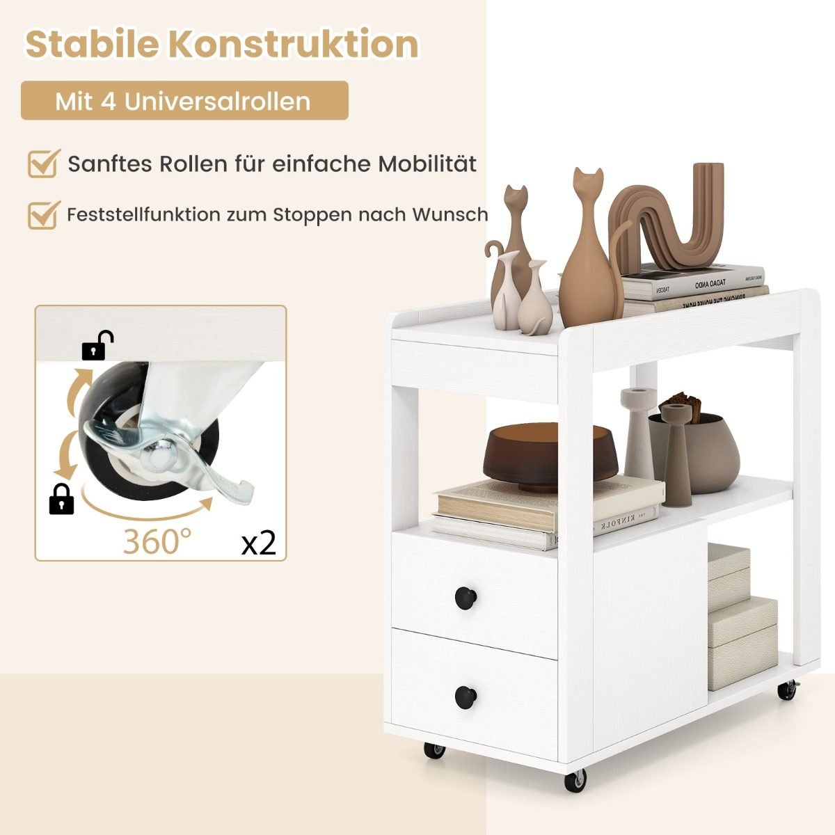 Mobilus staliukas su ratukais ir dviem stalčiais (Balta)