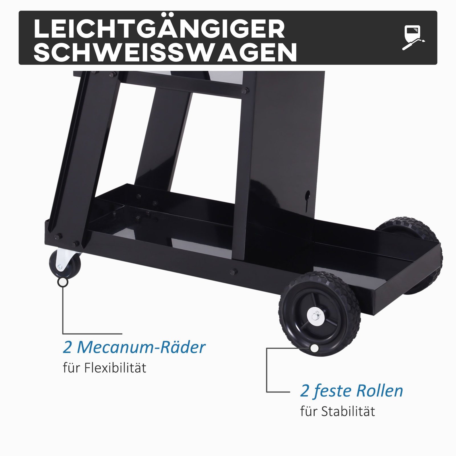 Su šiuo suvirinimo vežimėliu galite laikyti dujų balioną, suvirinimo aparatą, suvirinimo kaukę ir kitus priedus vienoje vietoje ir sutvarkyti visus savo įrankius taip, kad jie visada būtų po ranka. Tvirtas plieninis rėmas su milteliniu dažymu garantuoja ilgą tarnavimo laiką. Dėl manevringų ratukų suvirinimo vežimėlį labai lengva judinti. Puikiai tinka greitiems suvirinimo darbams ar sudėtingam, dideliam projektui.