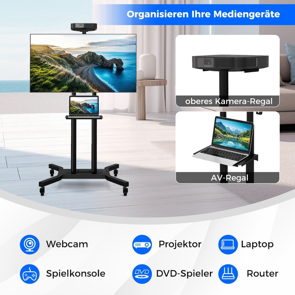 Mobilus televizoriaus stovas su ratukais ir kameros/AV laikikliais (Juoda)