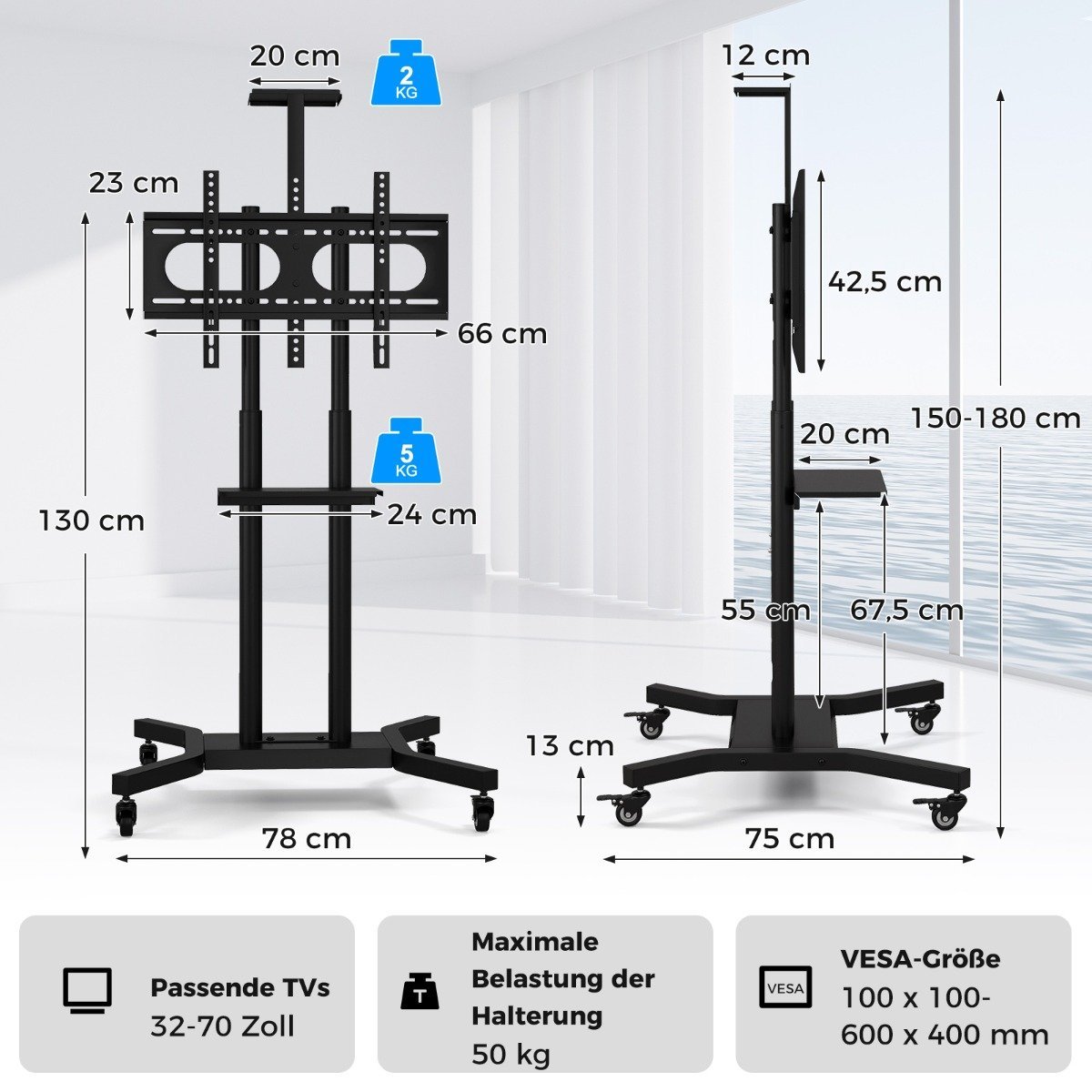 Pagerinkite savo žiūrėjimo patirtį su šiuo universaliu ir mobiliu televizoriaus stovu. Jis suteikia lankstumo, patogumo ir estetiško dizaino jūsų pramogų ar darbo zonai.