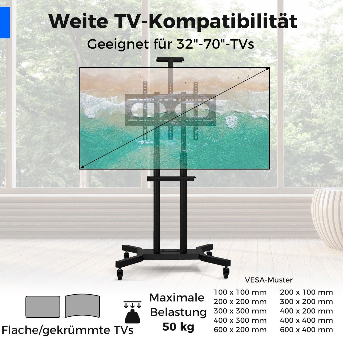 - Tinka 32–70 colių televizoriams, tiek plokščiaekraniams, tiek lenktiems.