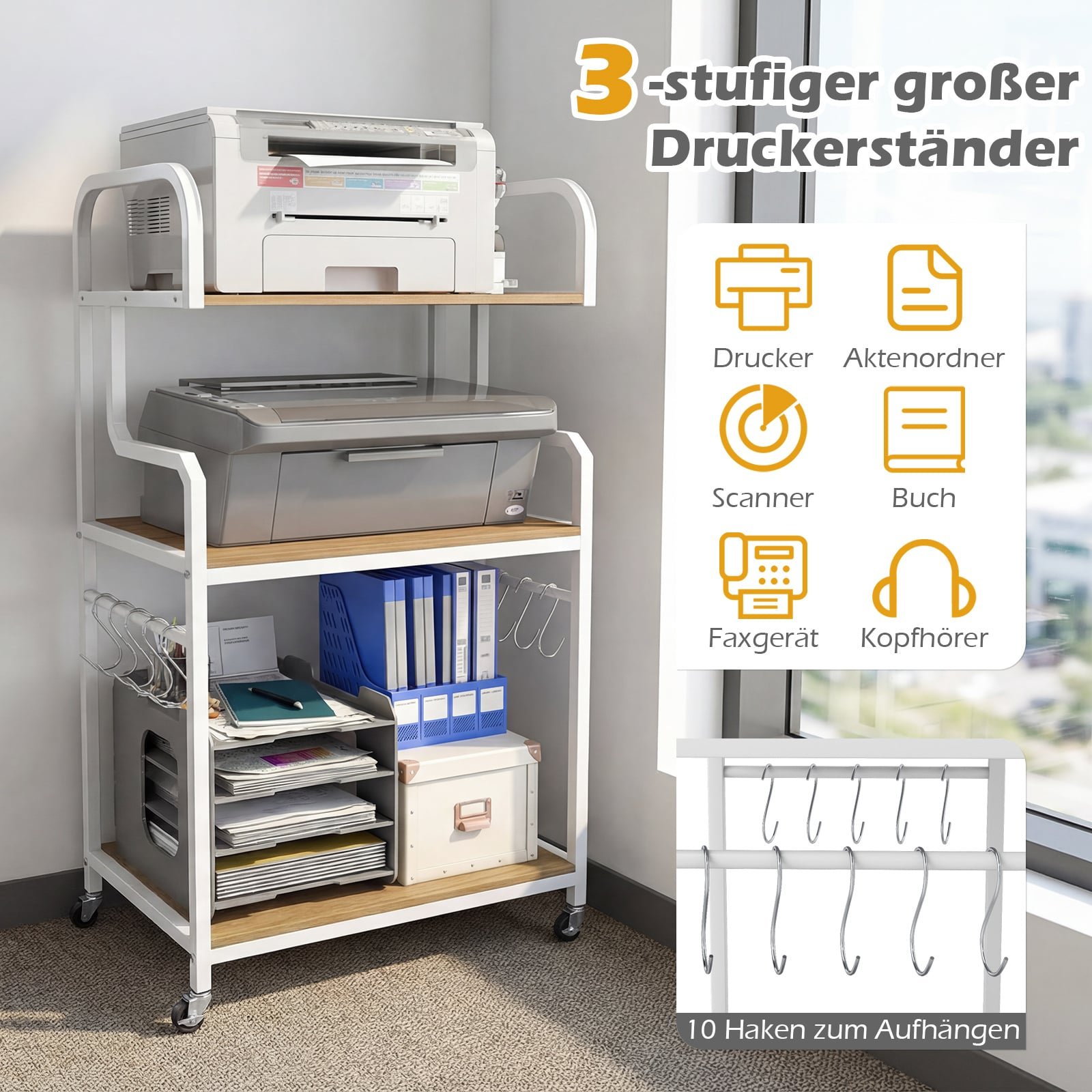 Paverskite savo darbo erdvę efektyvia ir tvarkinga su šiuo mobiliu spausdintuvo staliuku! Šis universalus baldas su trimis atviromis lentynomis ir net 10 papildomų kabliukų puikiai tiks spausdintuvams, dokumentams, biuro reikmenims ir net knygoms. Dėl įmontuotų ratukų su fiksatoriais staliuką galėsite lengvai perstumti ir patikimai užfiksuoti norimoje vietoje. Tvirta metalinė konstrukcija ir storos medienos lentynos užtikrins ilgalaikį stabilumą ir patikimumą.