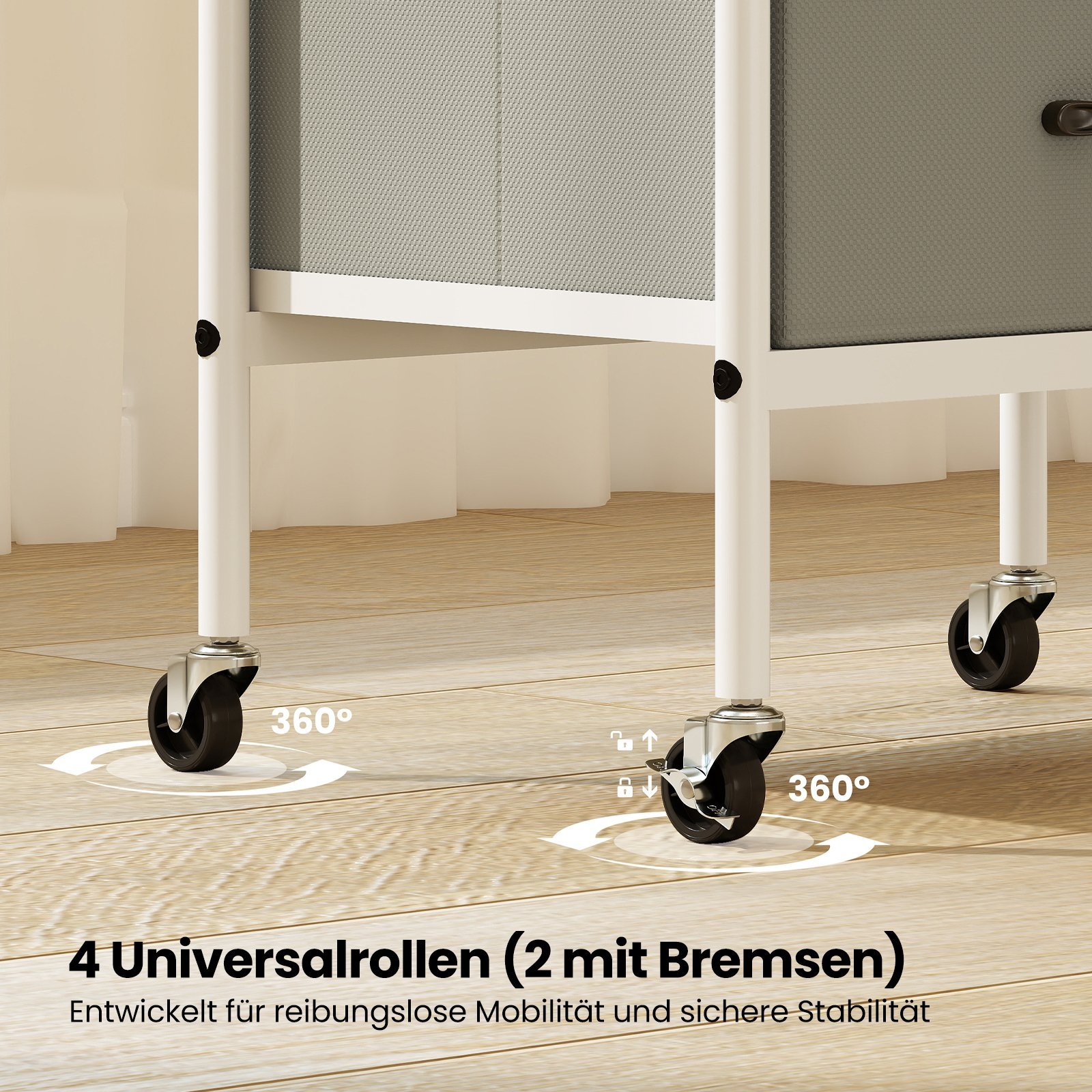 Šis universalus vežimėlis – puikus sprendimas jūsų daiktų laikymui ir tvarkymui, siūlantis patogų saugojimą ir lengvą mobilumą. Jo tvirta konstrukcija, suderinanti medines lentynas ir metalinį rėmą, garantuoja patikimą stabilumą ir ilgaamžiškumą. Du medžiaginiai stalčiai ir dvi atviros lentynos leidžia efektyviai organizuoti tiek matomus, tiek paslėptus daiktus.