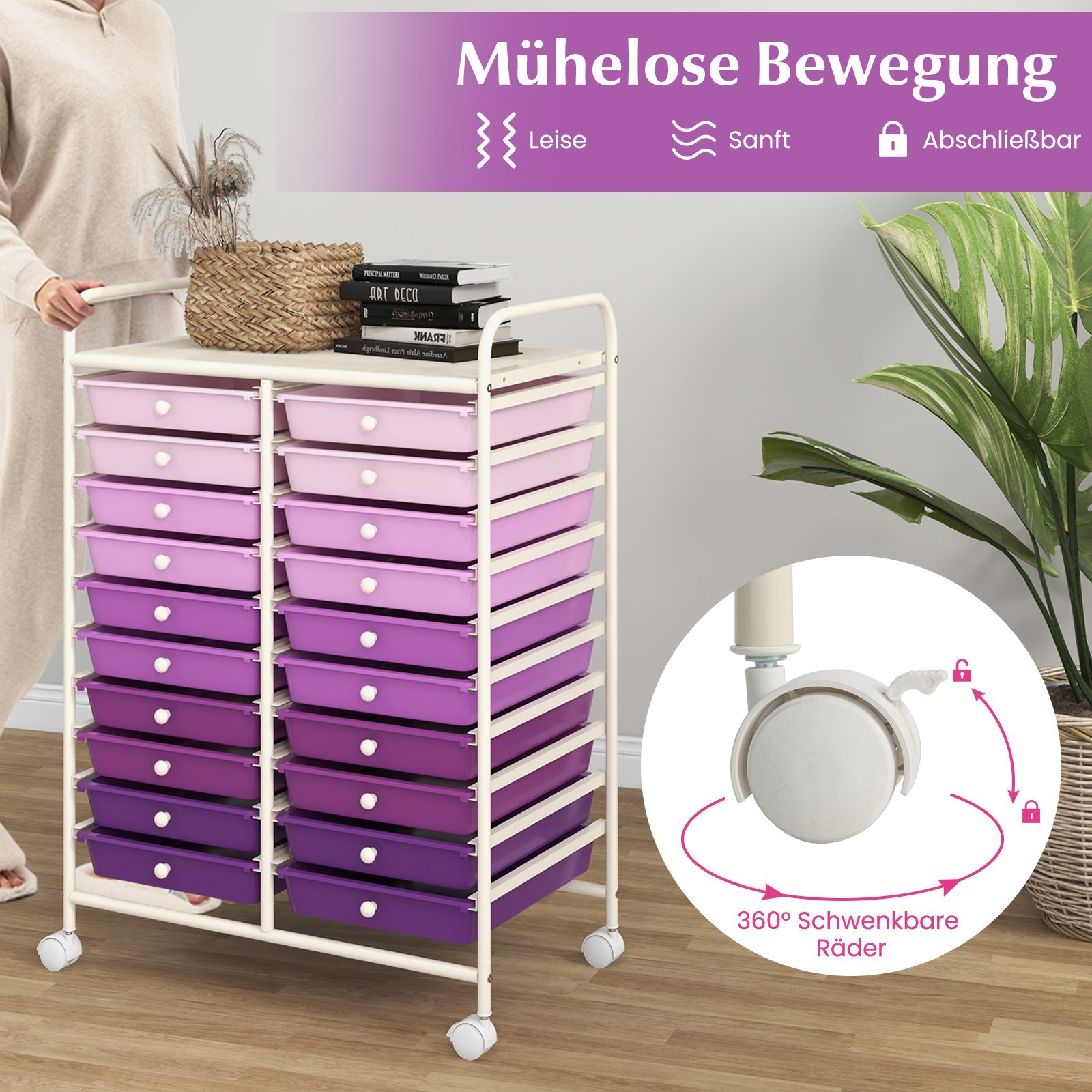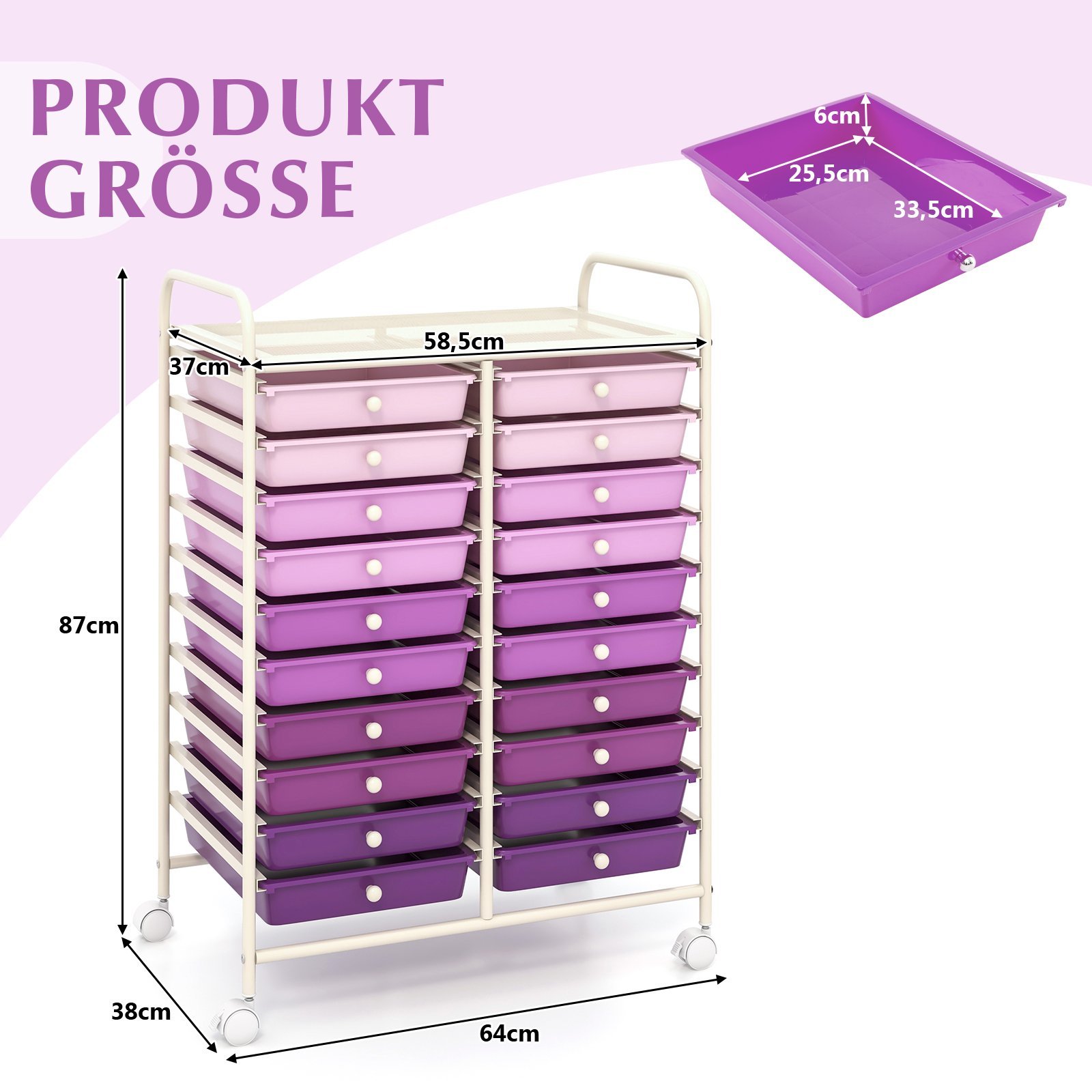 Mobilus vežimėlis su 20 stalčių ir tvirtu metaliniu rėmu (Violetinė)