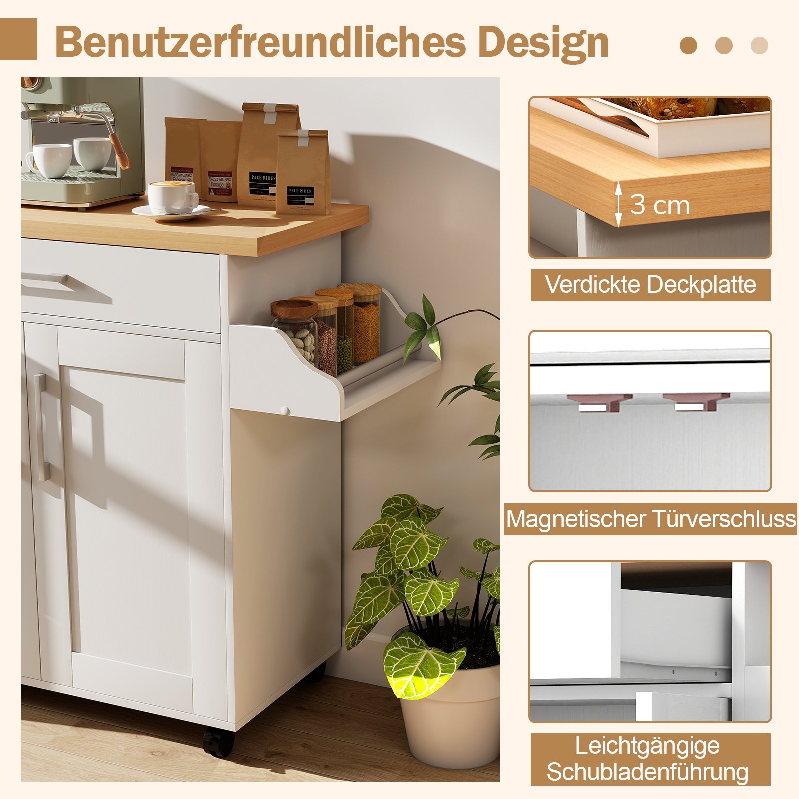 Šis universalus virtuvės vežimėlis puikiai sujungia papildomą erdvę maisto ruošai ir patogų daiktų laikymą. Su erdviu stalviršiu, giliu stalčiumi ir dviem uždaromis spintelėmis, jis padeda palaikyti tvarką virtuvėje, o integruoti šoniniai laikikliai užtikrina, kad prieskoniai ir rankšluosčiai visada būtų po ranka. Dėl keturių lengvai riedančių ratukų, iš kurių du fiksuojami, vežimėlį lengvai perstumsite ten, kur jo labiausiai reikia.