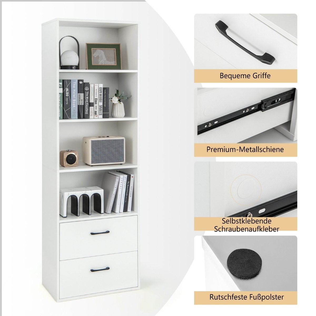 Moderni 6 pakopų knygų lentyna su stalčiais (Balta)