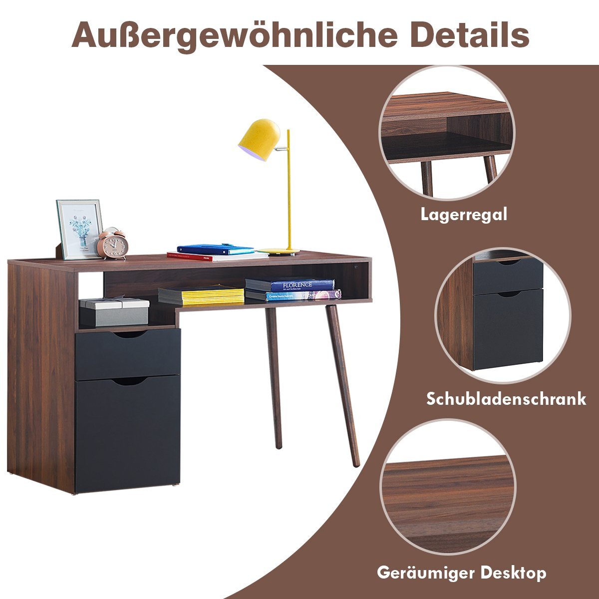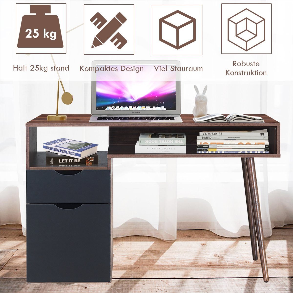 Šis modernaus stiliaus rašomasis stalas puikiai papildys jūsų darbo kambarį ar biurą, suteikdamas elegantišką išvaizdą ir praktišką daiktų laikymą. Atviros lentynos, ištraukiamas stalčius ir spintelė užtikrina pakankamai vietos biuro reikmenims tvarkingai sudėti.