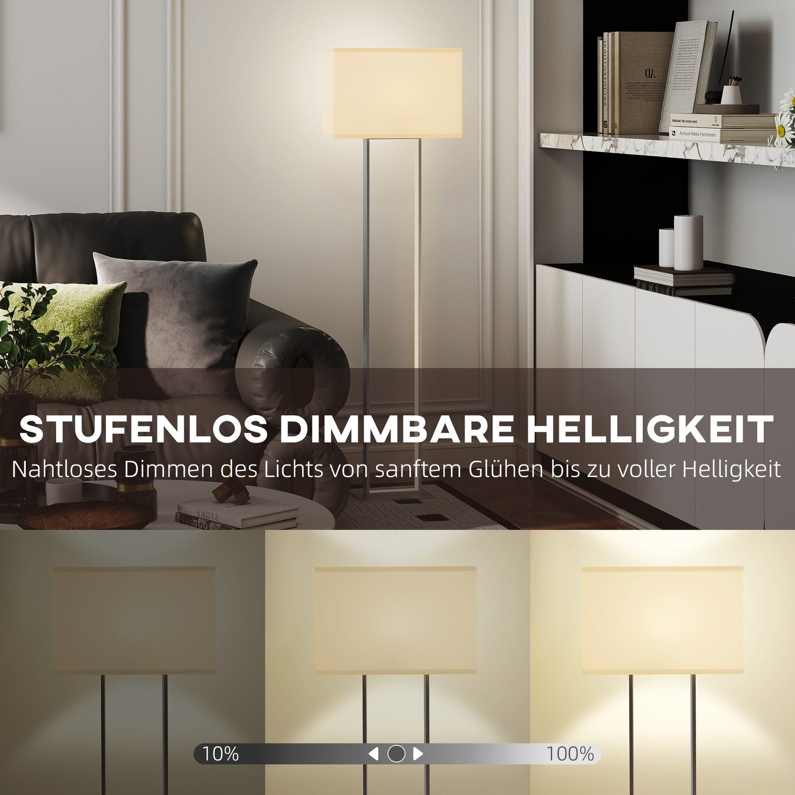 Išbandykite šiltą, minimalistinį stilių su moderniu pastatomu šviestuvu. Jo baltas lino gaubtas skleidžia švelnią šviesą, kuri sukuria jaukią atmosferą. Stačiakampis pastatomo šviestuvo metalinis rėmas satino nikelio apdailos suteikia elegancijos bet kuriai patalpai. Išmaniuoju kojiniu jungikliu galima pasirinkti tris apšvietimo režimus ir tolygiai reguliuoti ryškumą (10% – 100%). Paprastas būdas puikiai apšviesti jūsų erdvę.