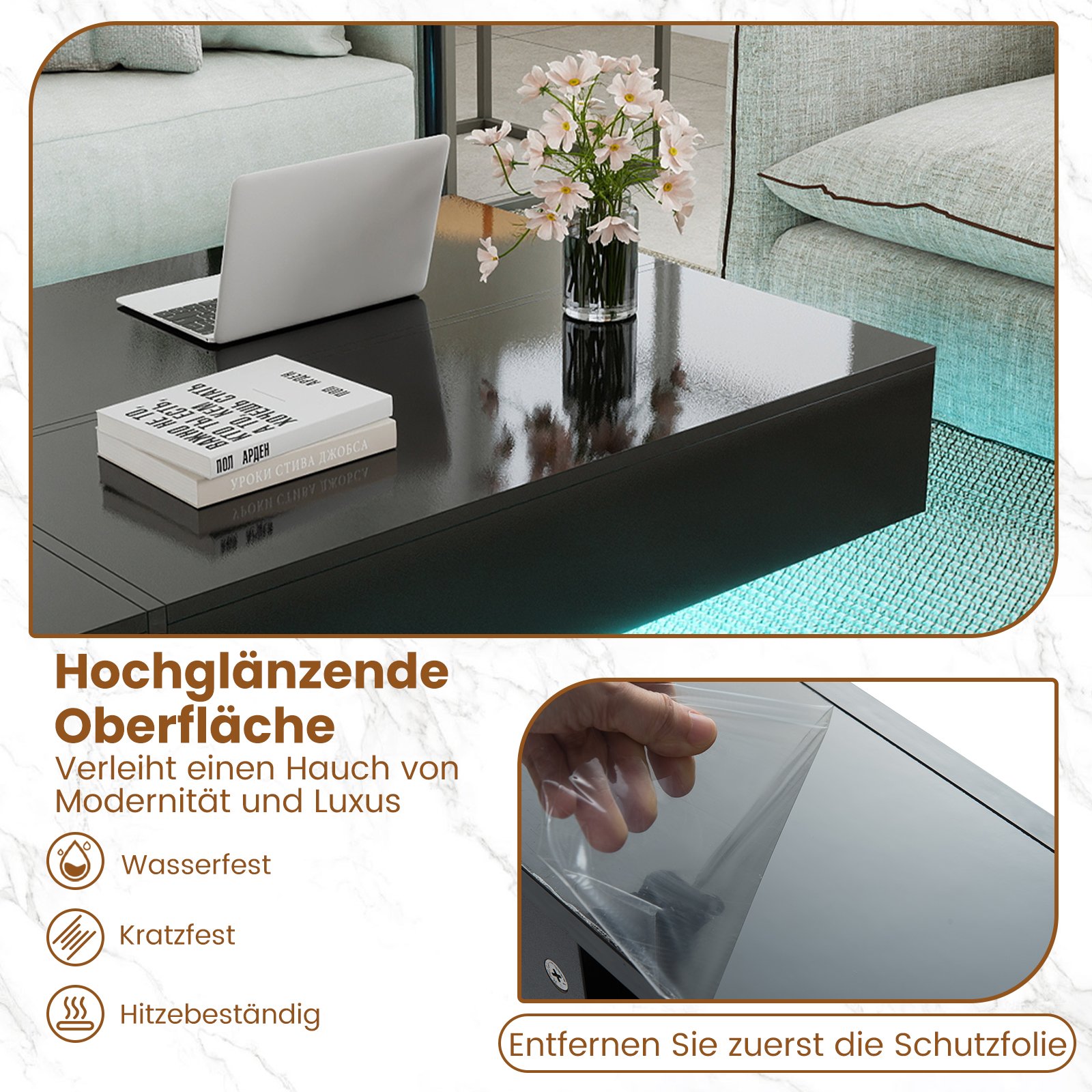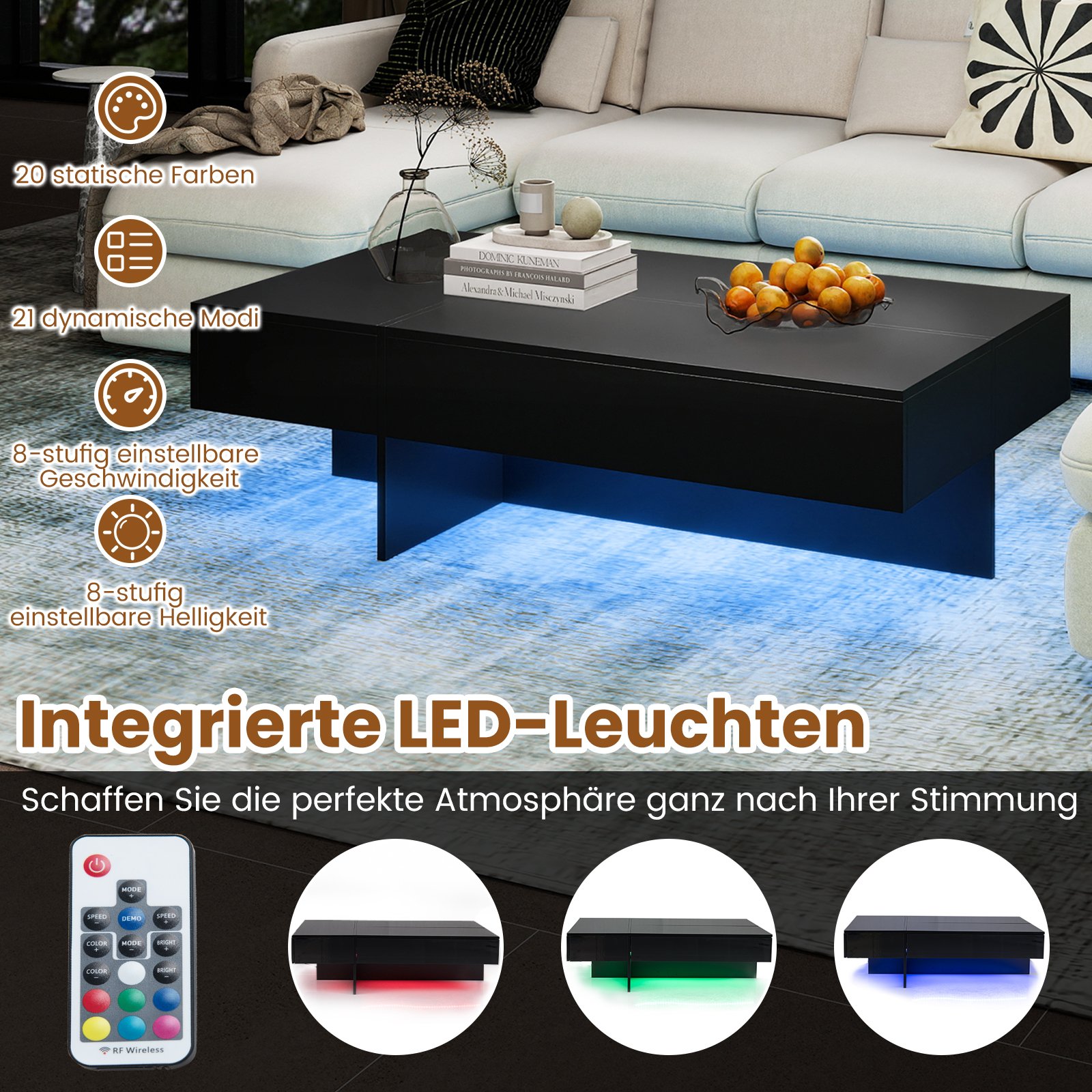 Atraskite tobulą akcentą savo erdvei su šiuo moderniu kavos staliuku. Jis ne tik išsiskiria itin blizgiu, įbrėžimams atspariu paviršiumi, bet ir suteikia gyvybės jūsų namams su daugiaspalve LED apšvietimo juosta. Sukurkite tobulą atmosferą bet kokiai progai, rinkdamiesi iš 20 spalvų ir 21 režimo, lengvai valdomų patogiu nuotolinio valdymo pulteliu.