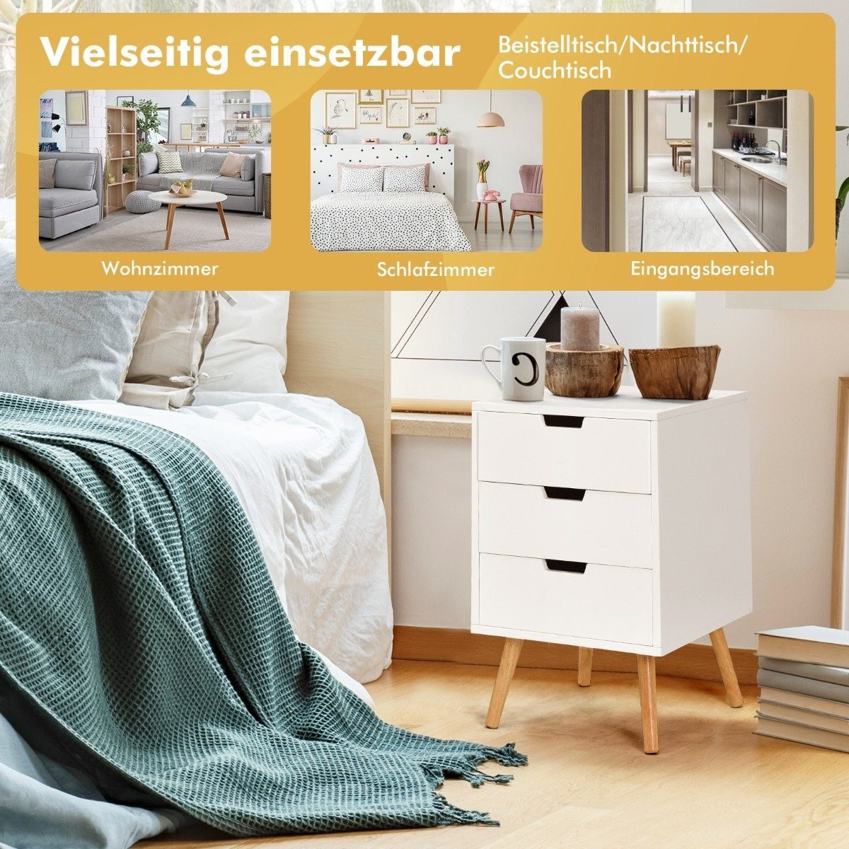 Modernus medinis trijų stalčių naktinis staliukas (Balta)