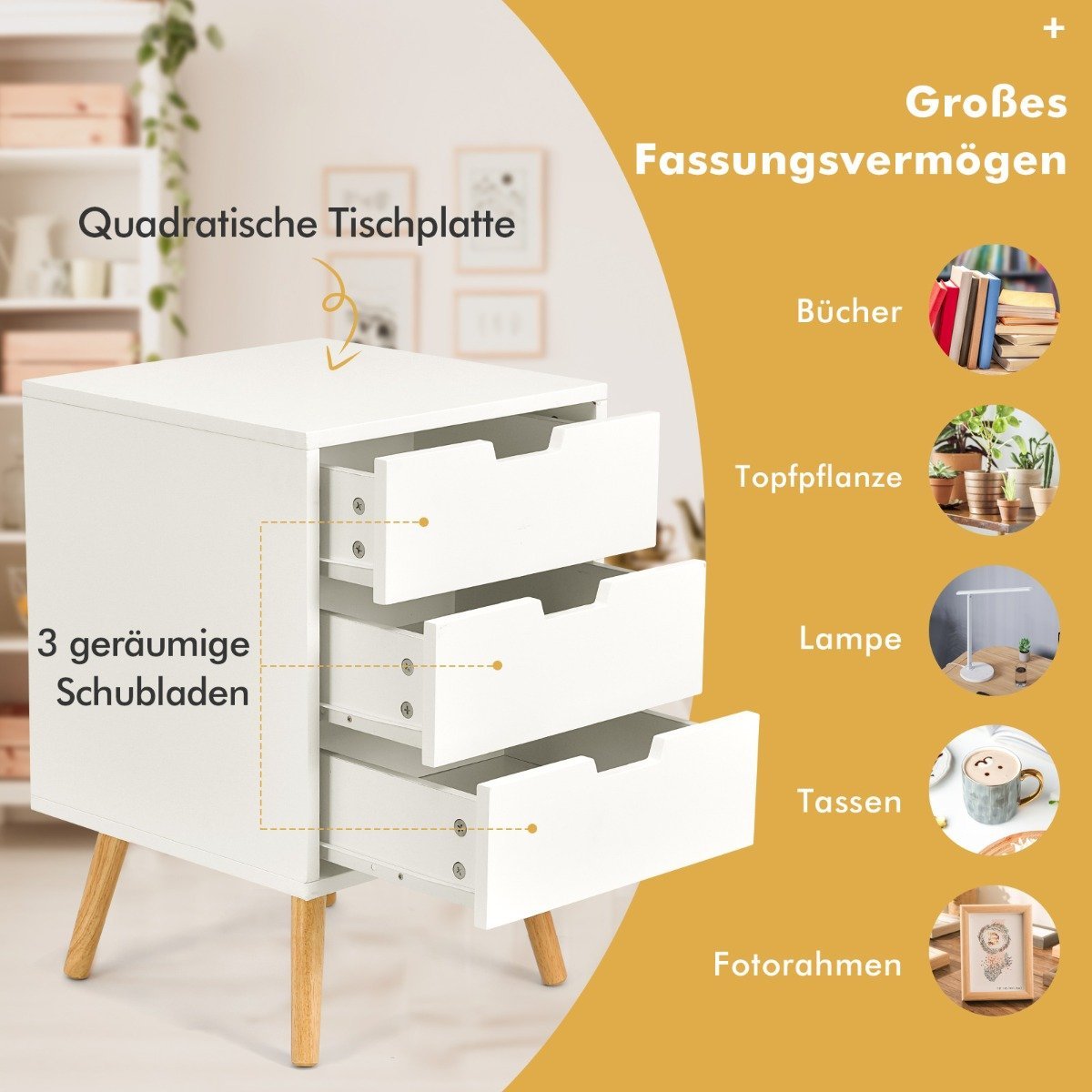 Šis trijų stalčių naktinis staliukas suteiks jūsų namams jaukumo ir palengvins kasdienybę. Dėl trijų talpių stalčių galėsite tvarkingai laikyti visus reikalingus daiktus ir palaikyti tvarką šalia lovos. Kvadratinis stalviršis, pagamintas iš aukštos kokybės MDF plokštės su baltu paviršiumi, puikiai tiks pasidėti naktinei lempai, nuotraukų rėmeliams ar dekoratyviniams augalams.