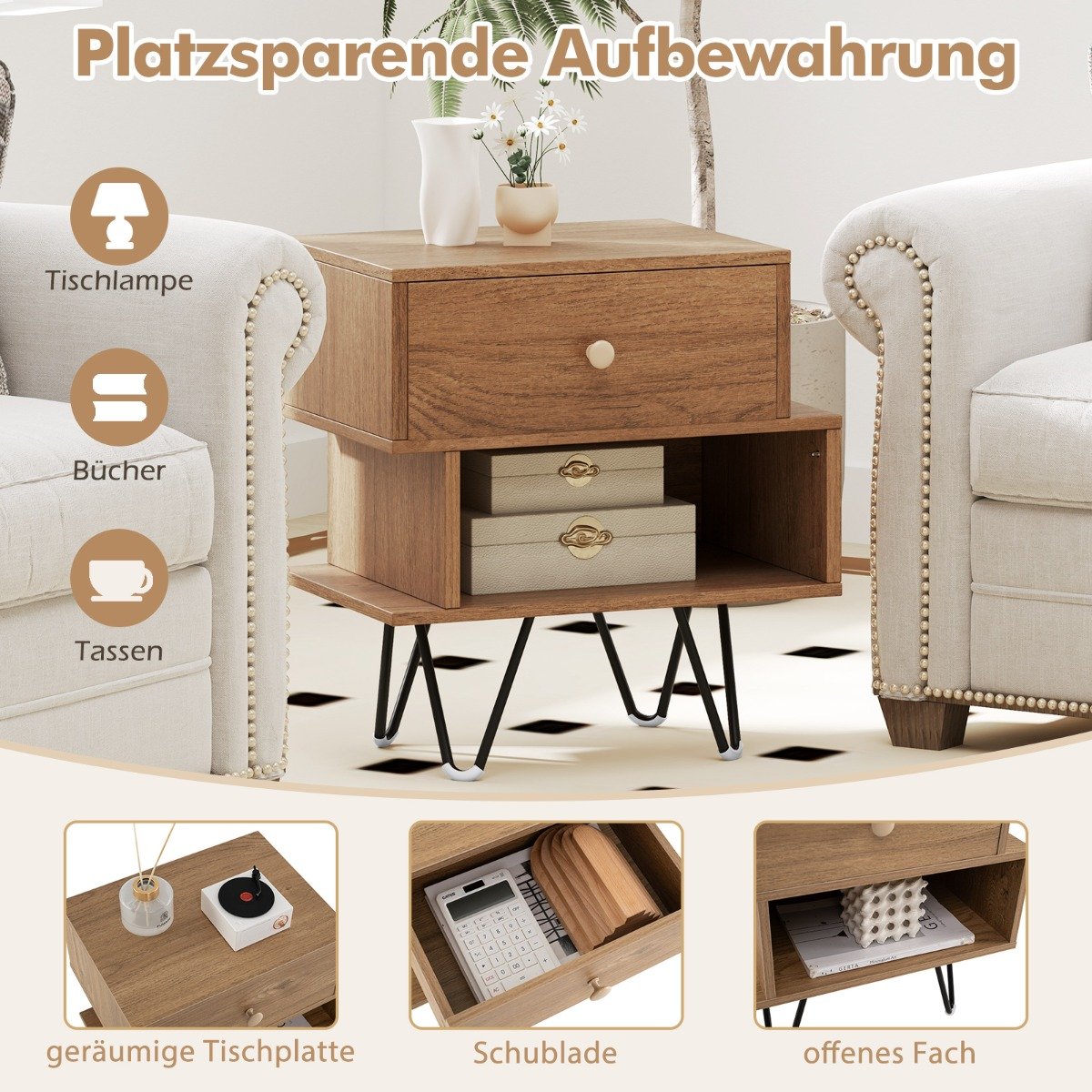 Atnaujinkite savo namus su šiuo stilingu ir universaliu naktinių staliukų komplektu! Jis suteikia patogų stalviršį jūsų naktinėms lektūroms ar biuro reikmenims bei pritaikomą stalčių jūsų asmeniniams daiktams laikyti.