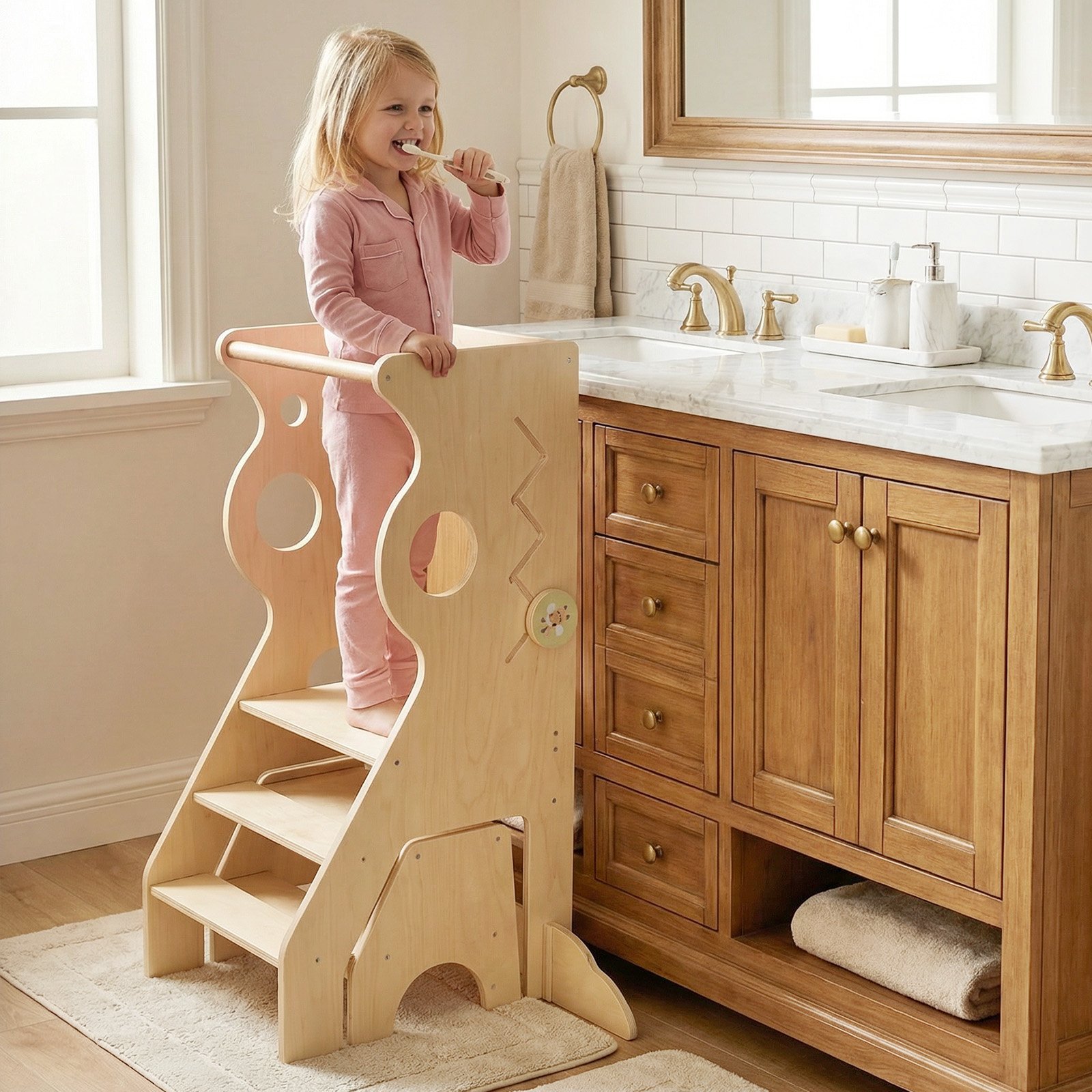 - Skatina vaiko savarankiškumą: suteikia vaikui galimybę saugiai pasiekti stalviršį ar kriauklę ir aktyviai dalyvauti kasdienėse veiklose.
