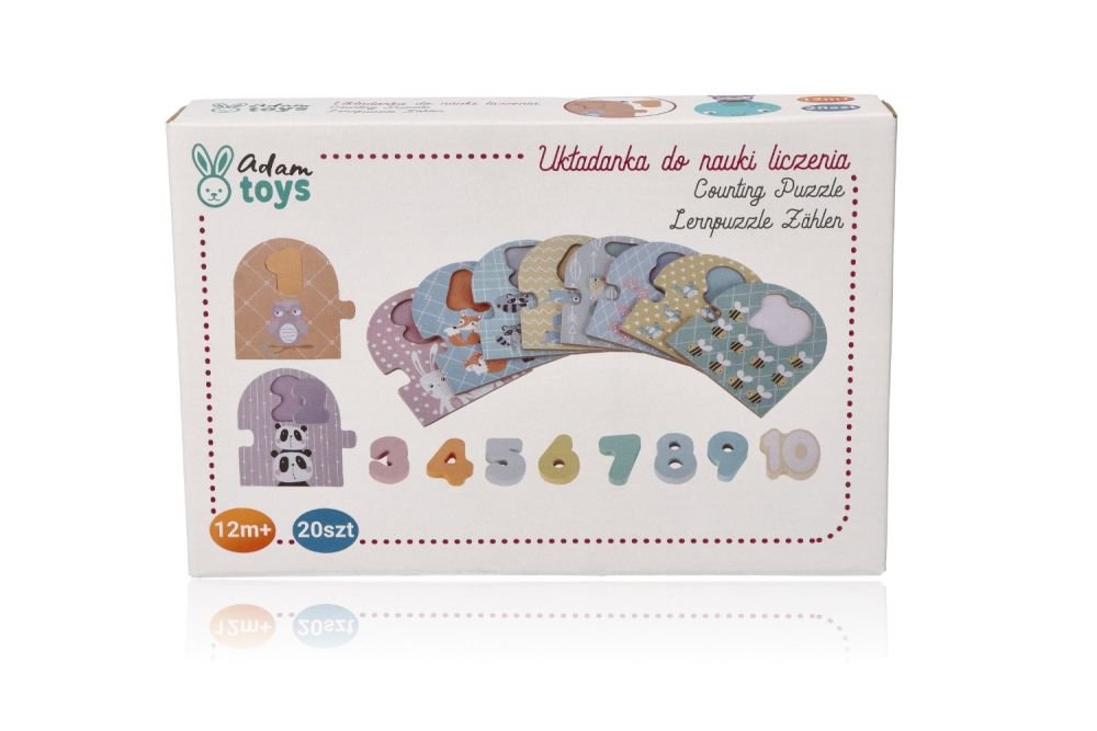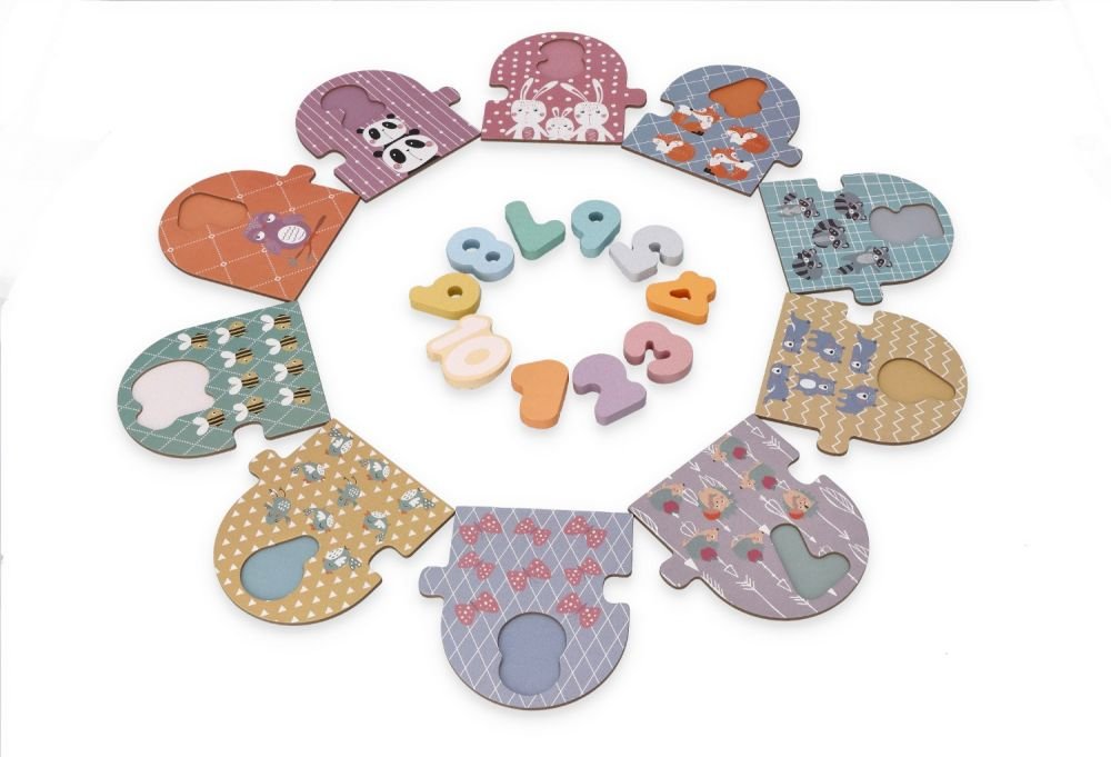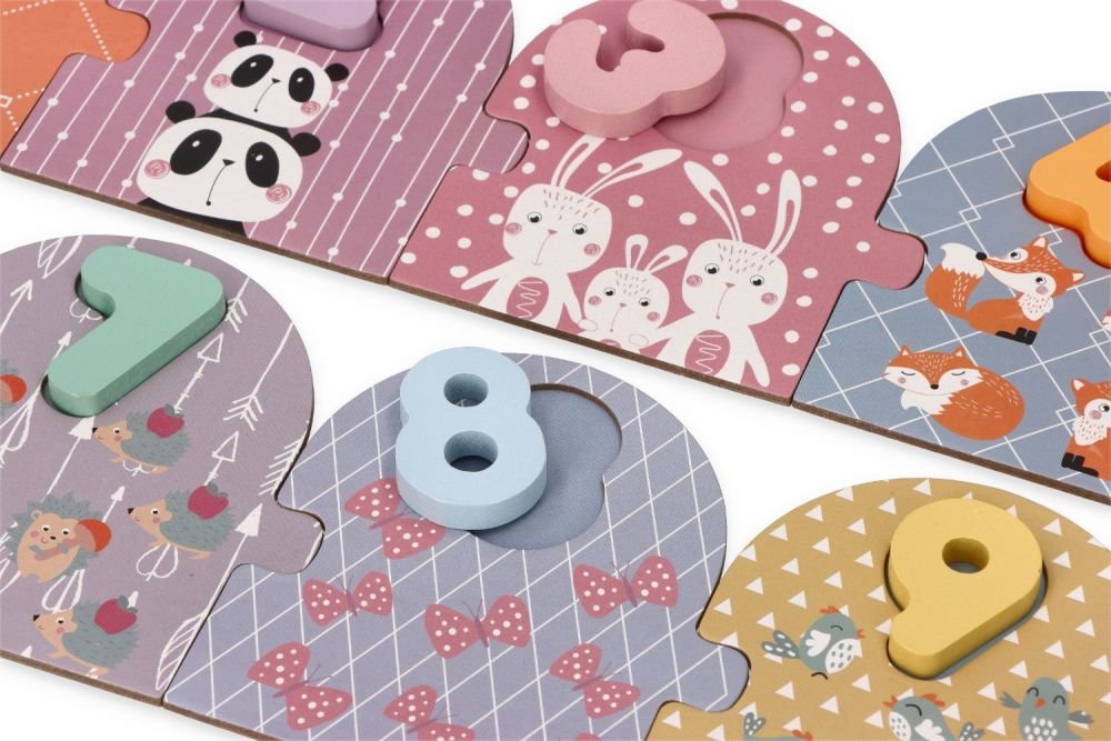 Matmenys: dėlionės elemento 10 x 12 cm, skaitmens elemento 4,5 x 3 cm. Išdėliota visų skaitmenų eilutė siekia net 100 cm.