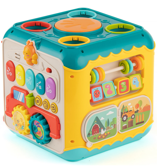 - Daug funkcijų: „6in1“ – pianinas, rūšiuoklis, labirintas, kaladėlių kalimas plaktuku, perpynė ir durelės su užraktu
