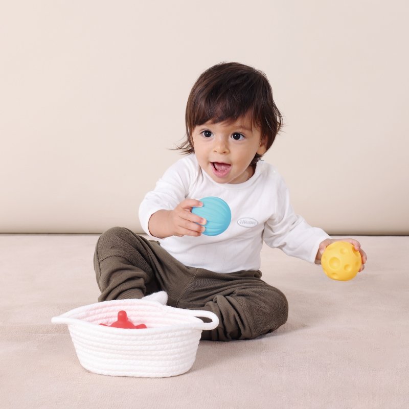 Rinkinį sudaro 3 sensoriniai kamuoliukai, skirtingų paviršių, ir pintas krepšelis, į kurį baigus žaisti galima sudėti kamuoliukus. Dėl skirtingų paviršių kamuoliukai puikiai lavina mažylio pojūčius. Spalvingi kamuoliukai skatina vaiką juos griebti ir manipuliuoti jais žaidžiant ant pilvuko, o tai padeda treniruoti rankų ir kojų raumenis bei ruošia ropojimui. Pintas krepšelis leidžia vaikams išimti ir įdėti kamuoliukus, kartu mokant juos „tuščia“ ir „pilna“ sąvokų. Šis žaislas saugiai skatina natūralų vaiko smalsumą ir judesių koordinacijos raidą.