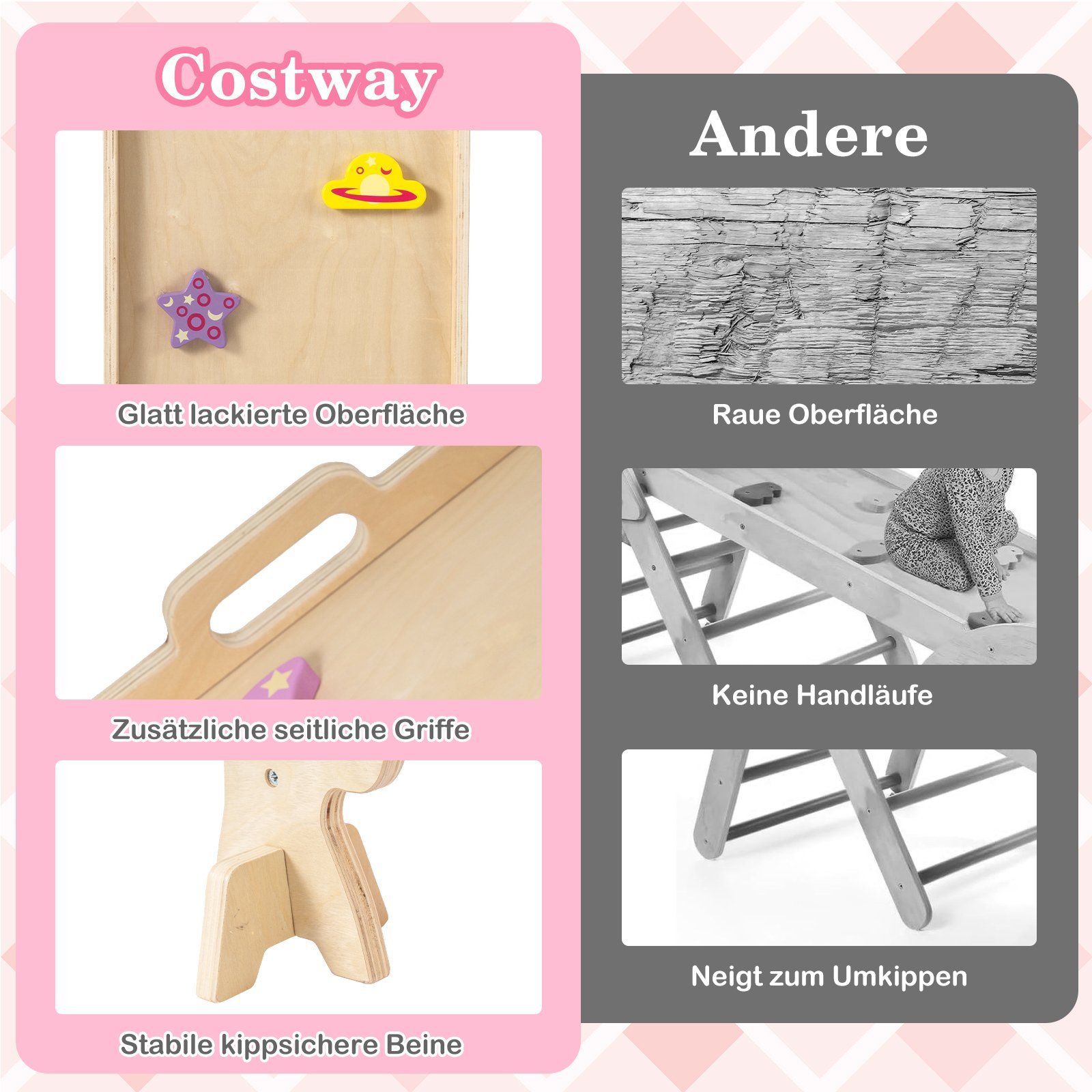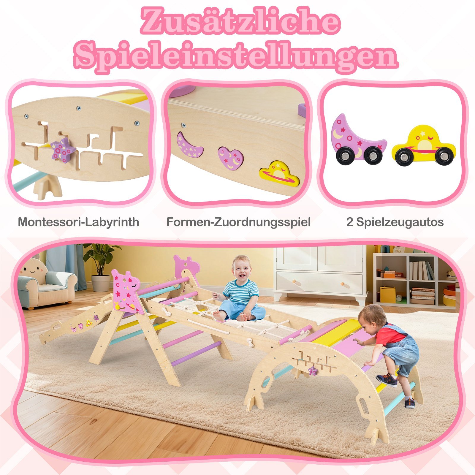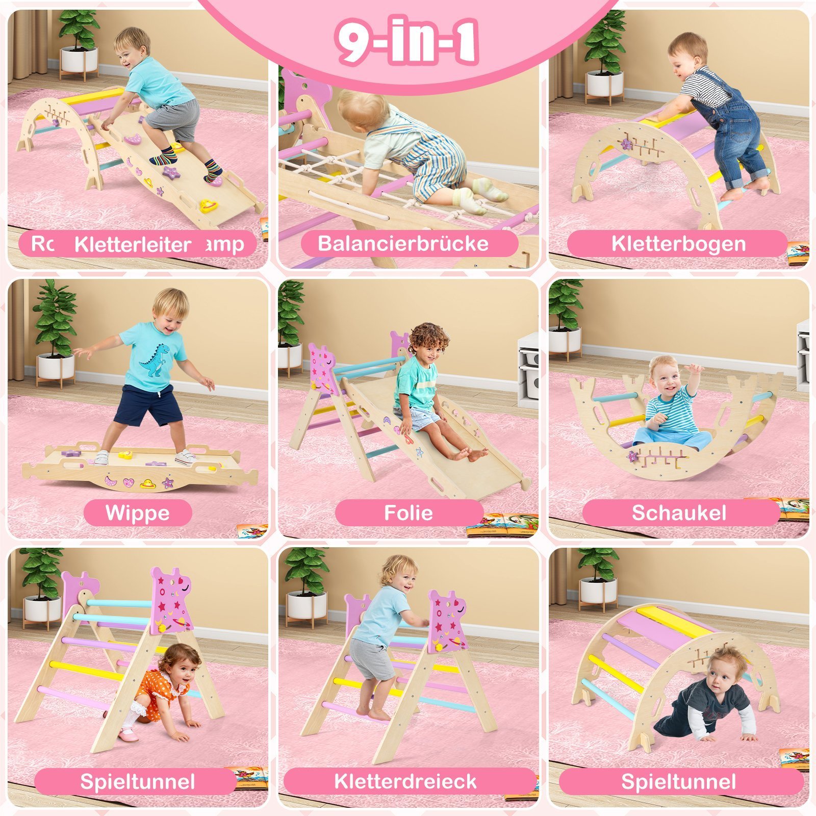• Universalus 8-in-1 rinkinys su įvairiomis žaidimo galimybėmis (laipiojimo trikampis, sūpynių lenta, rampa, balanso tiltas ir t.t.).