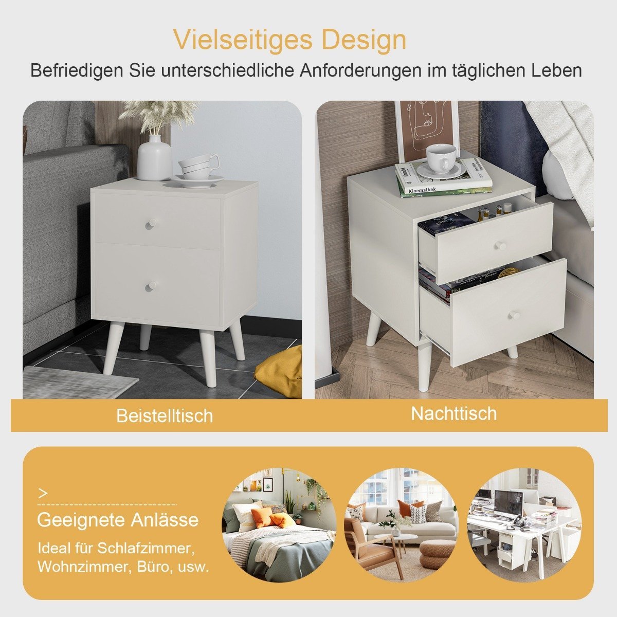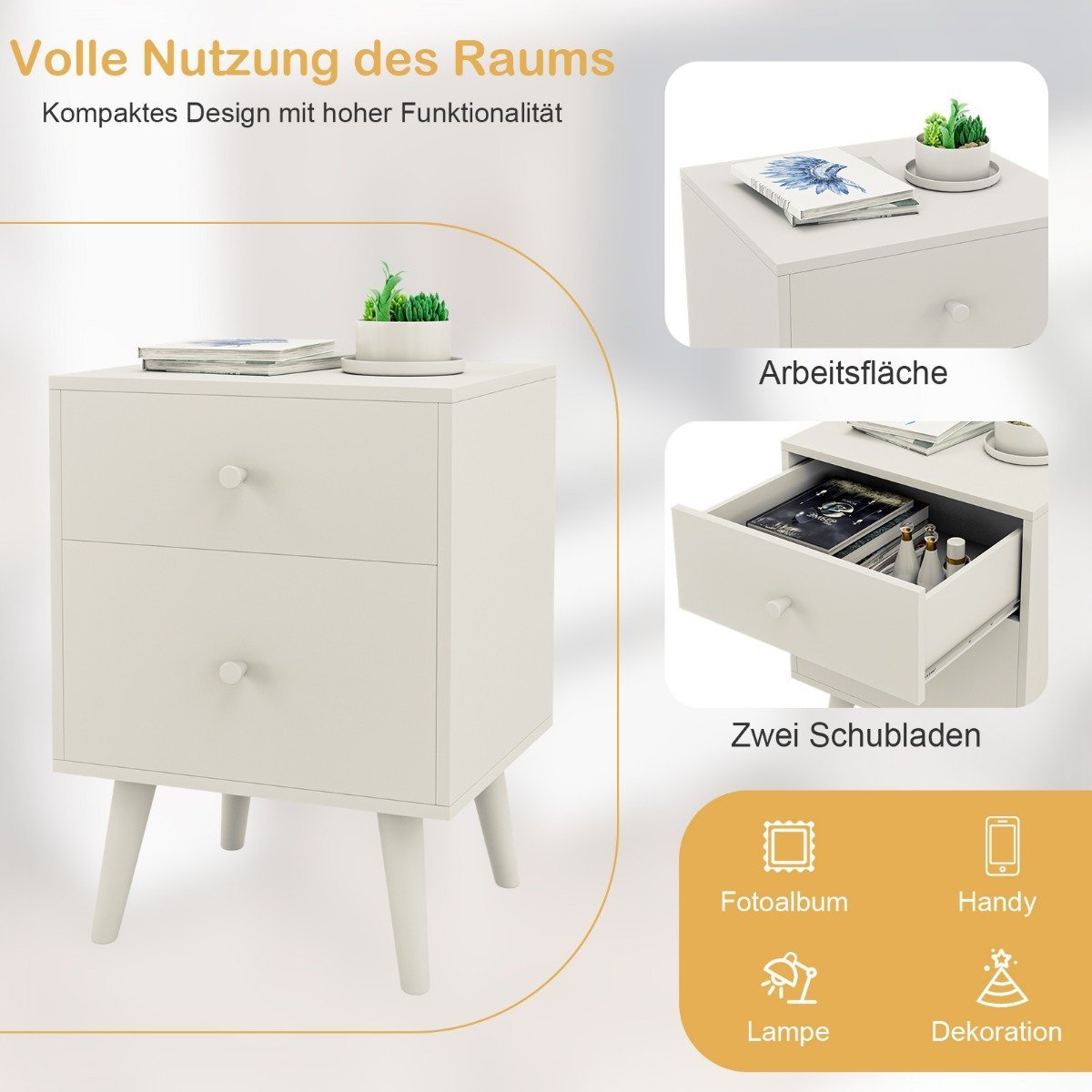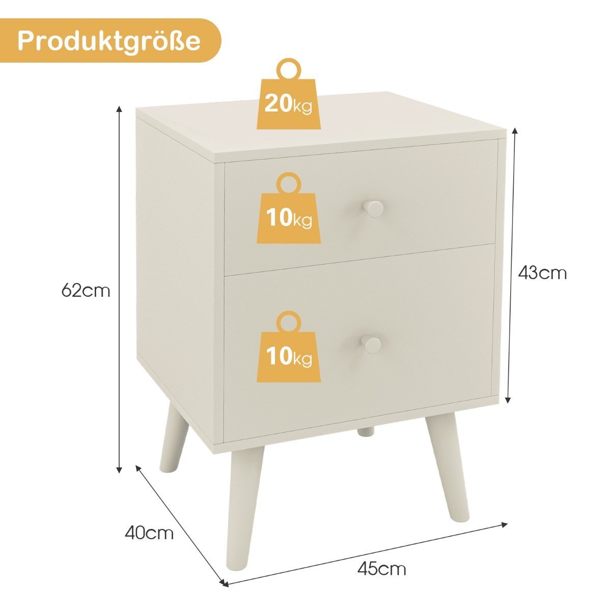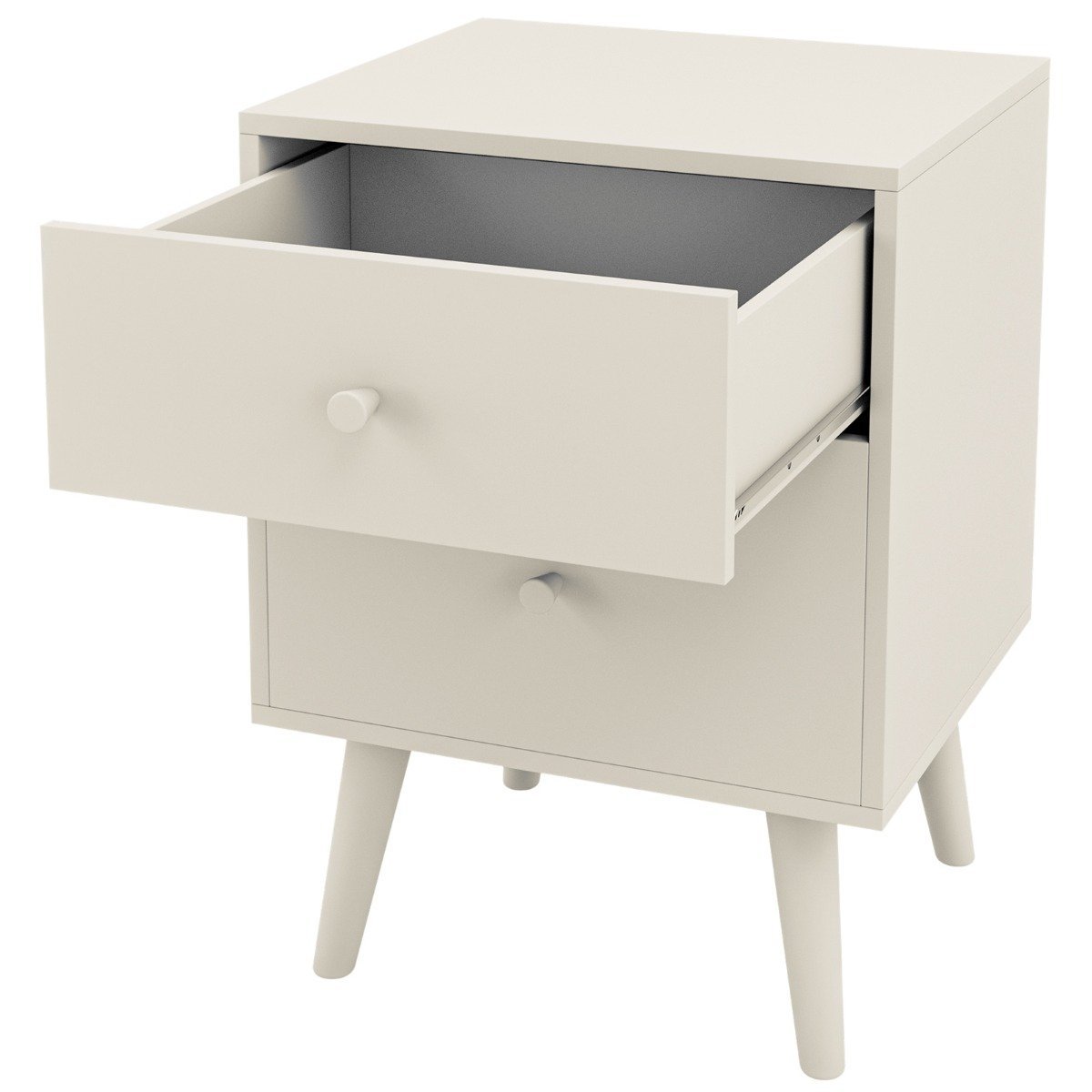 Naktinis staliukas su dviem stalčiais ir medinėmis kojomis (Balta)