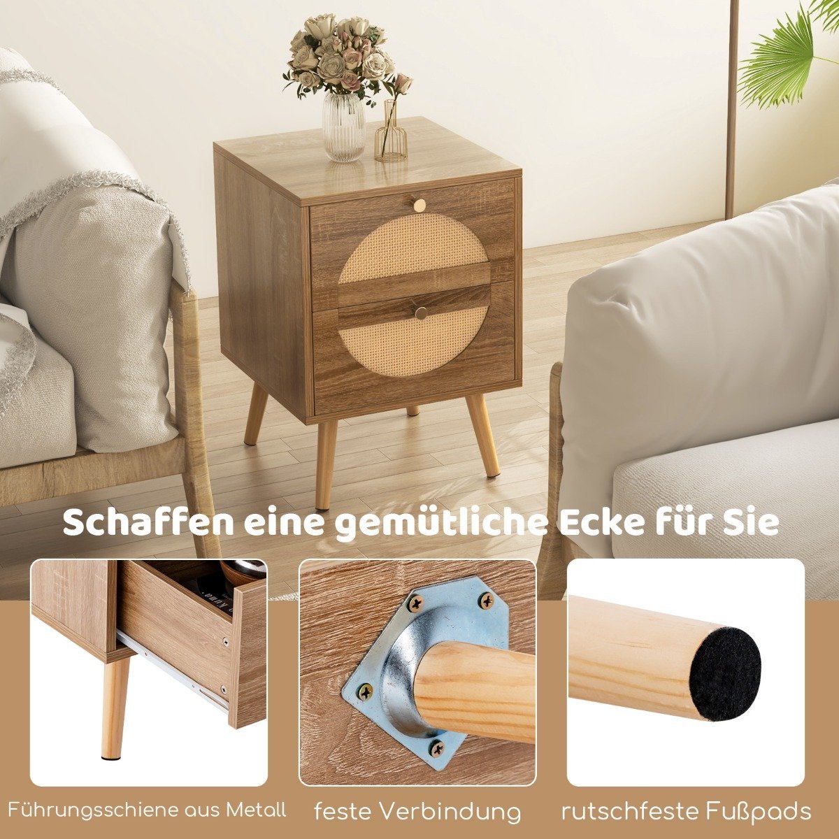Naktinis staliukas su dviem stalčiais ir medinėmis kojomis (Natūrali)