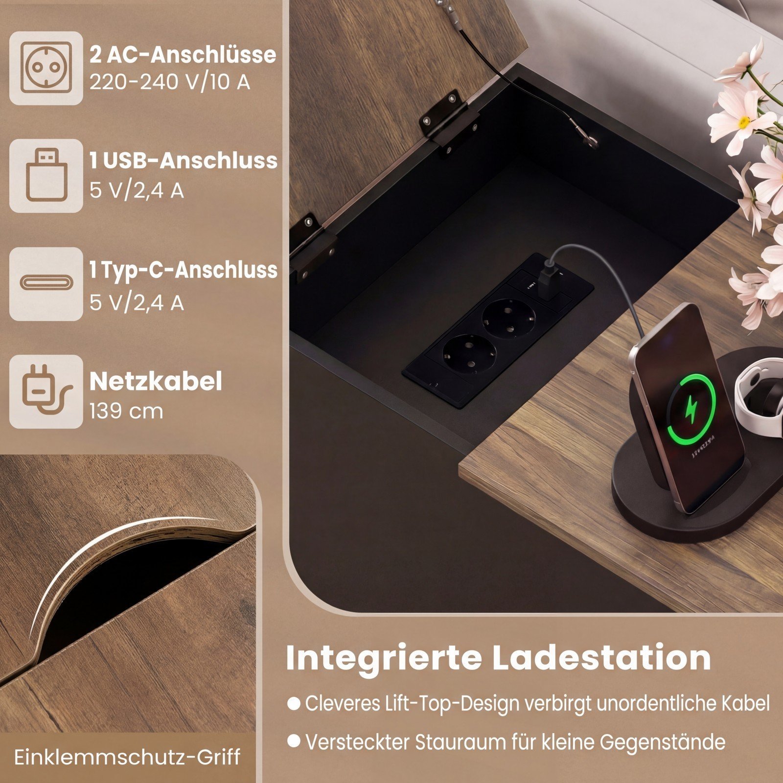 - Integruota įkrovimo stotelė su 2 elektros lizdais, USB ir Type-C jungtimis leidžia vienu metu įkrauti kelis įrenginius.