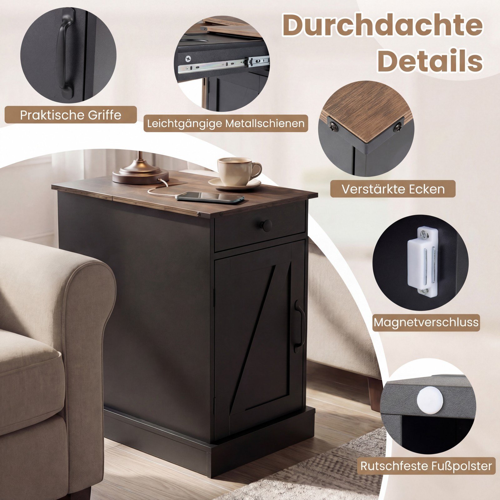 Šis modernus šoninis staliukas sujungia stilių ir funkcionalumą, puikiai papildydamas jūsų namų interjerą. Jame rasite gausybę daiktų laikymo vietos: erdvią viršutinę plokštę, funkcionalų stalčių su išimamu padėklu ir spintelę su reguliuojamo aukščio lentyna. Integruota įkrovimo stotelė leidžia patogiai įkrauti įrenginius. Be to, sulankstomas stalviršis sukuria papildomą paslėptą erdvę ir leidžia paslėpti laidus, palaikant tvarkingą aplinką.