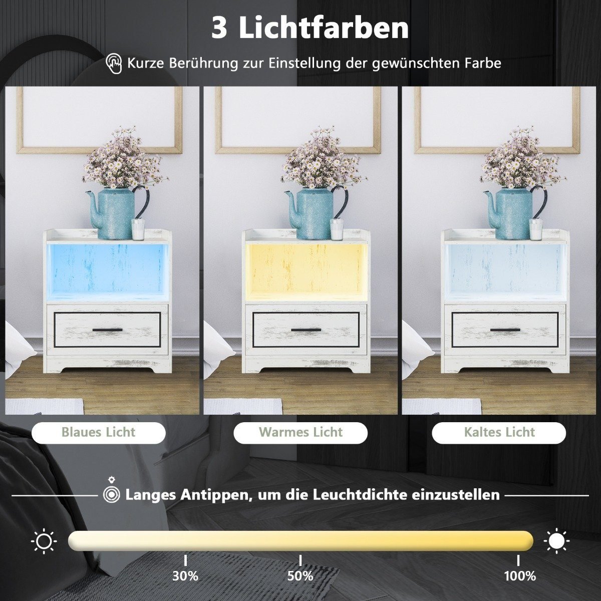 Naktinis staliukas su LED apšvietimu ir USB/Type-C įkrovimo stotele (Balta)