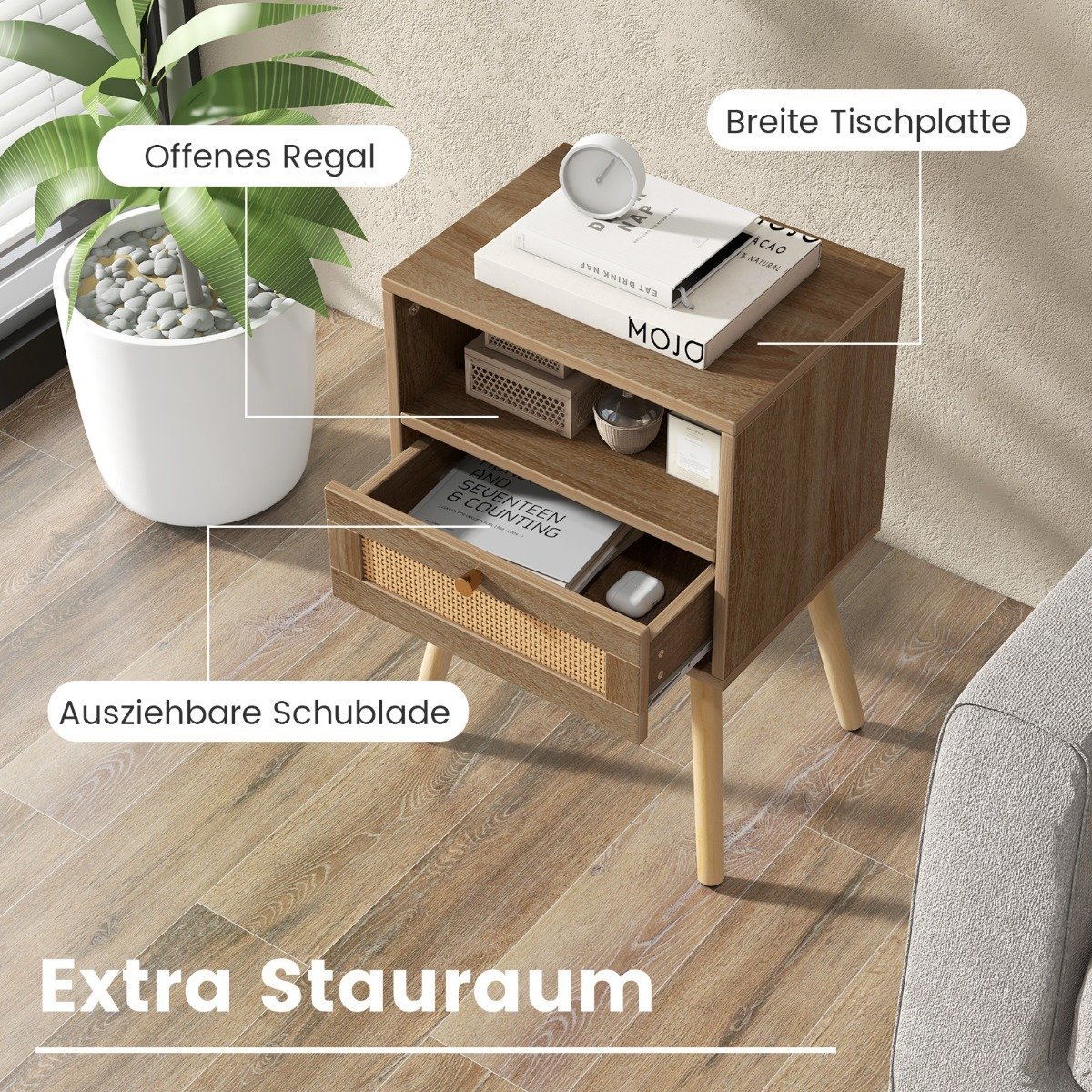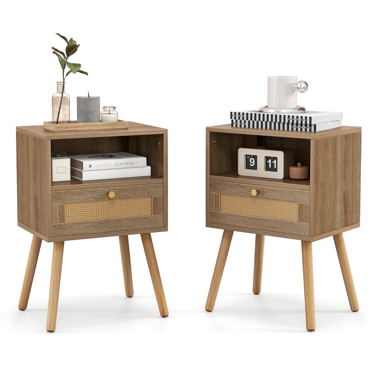 Ieškote stilingo naktinio staliuko savo miegamojo interjerui? Šis dviejų vienetų naktinių staliukų komplektas suteiks jūsų erdvei bohemiško žavesio. Optiškai patrauklus staliukas derina natūralią medžio tekstūrą su subtiliomis rotango detalėmis, suteikdamas bet kuriai erdvei svetingumo ir laisvos dvasios pojūtį. Jis taip pat siūlo pakankamai vietos jūsų nuotolinio valdymo pulteliams, kavai, žurnalams ir stalo lempoms.