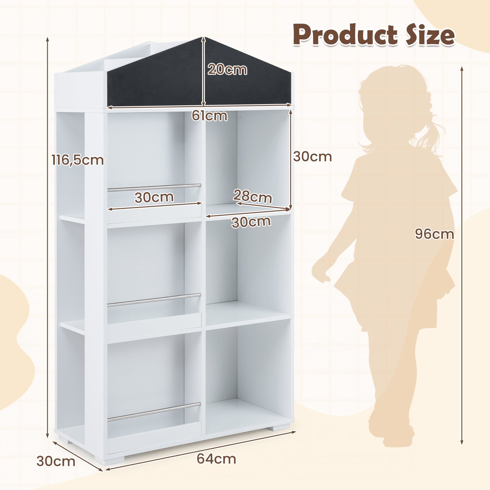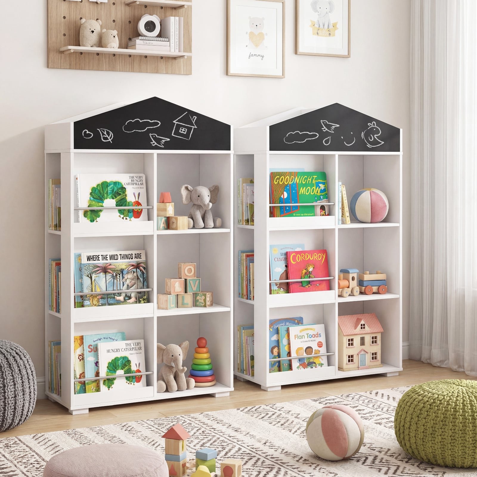 Ši namelio formos knygų lentyna yra puiki vieta vaikų knygoms, žaislams ir kitiems lobiams laikyti. Ši daugiafunkcinė lentyna ne tik suteikia gausybę skyrių tvarkingam daiktų laikymui, bet ir turi integruotą kreidinę lentą, skatinančią mažylių kūrybiškumą. Jos žavingas dizainas ir praktiškumas pavers ją mėgstamiausiu baldu kiekviename vaiko kambaryje.